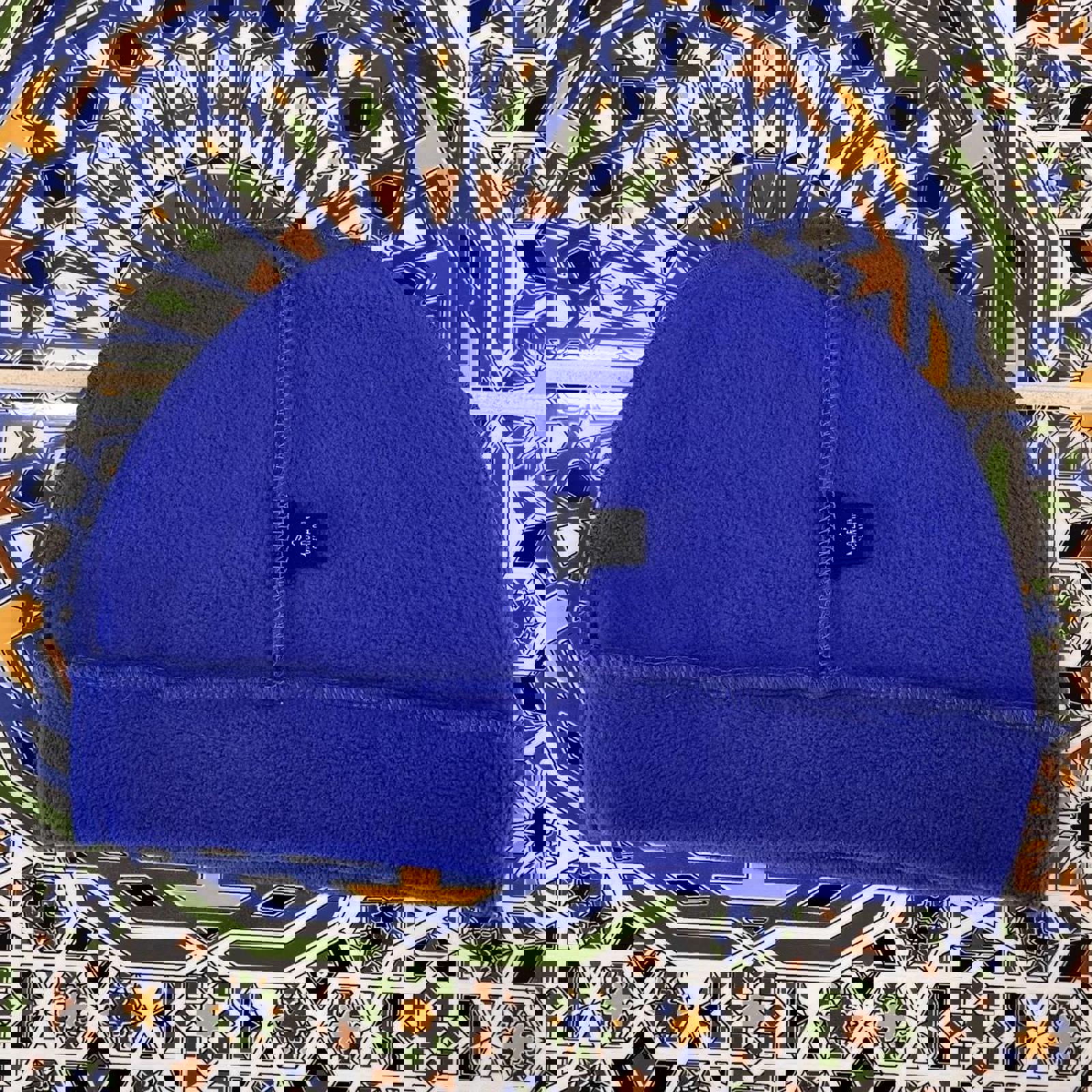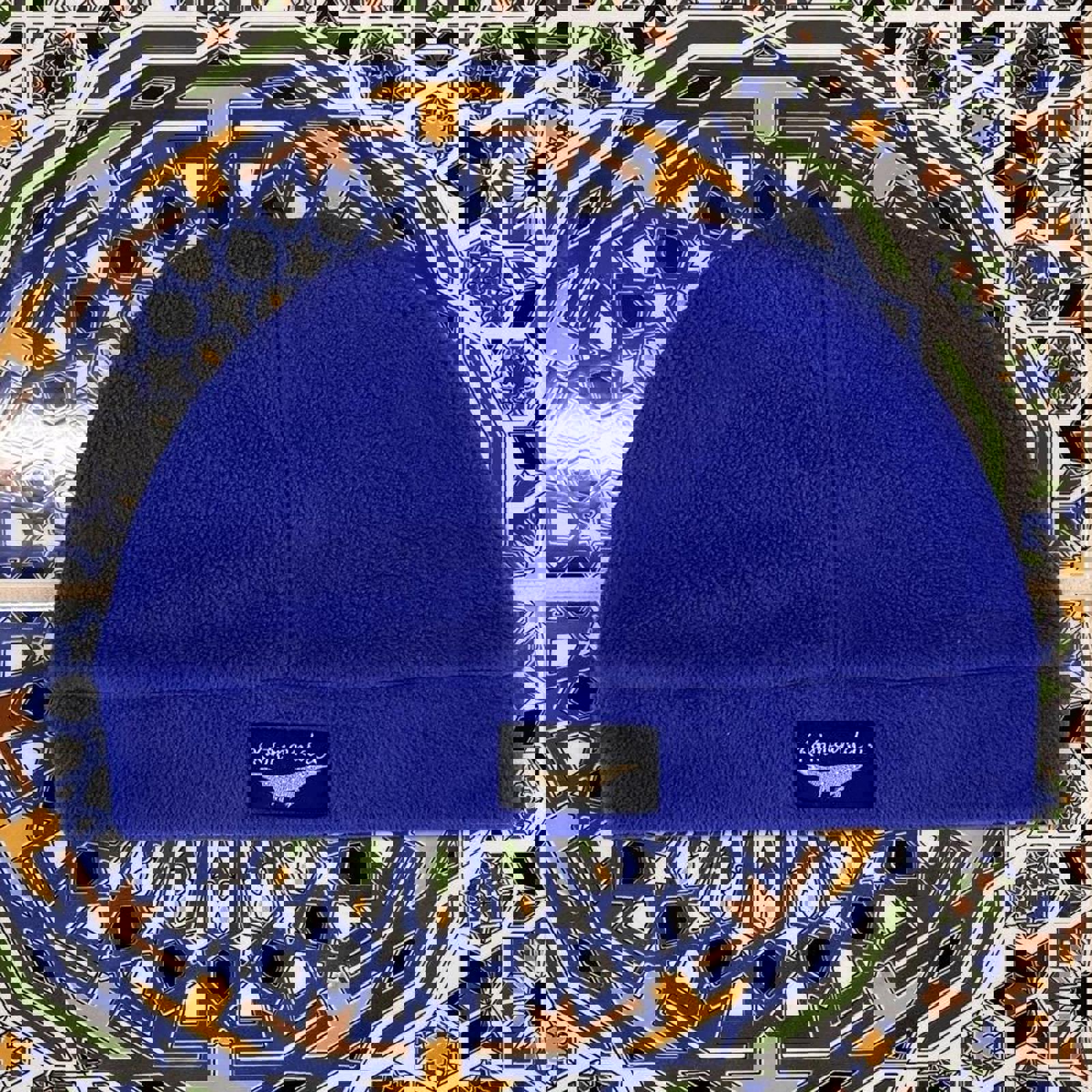 Blue beanie with a black Kathmandu patch on the front with a tan pangolin and white Kathmandu spell out