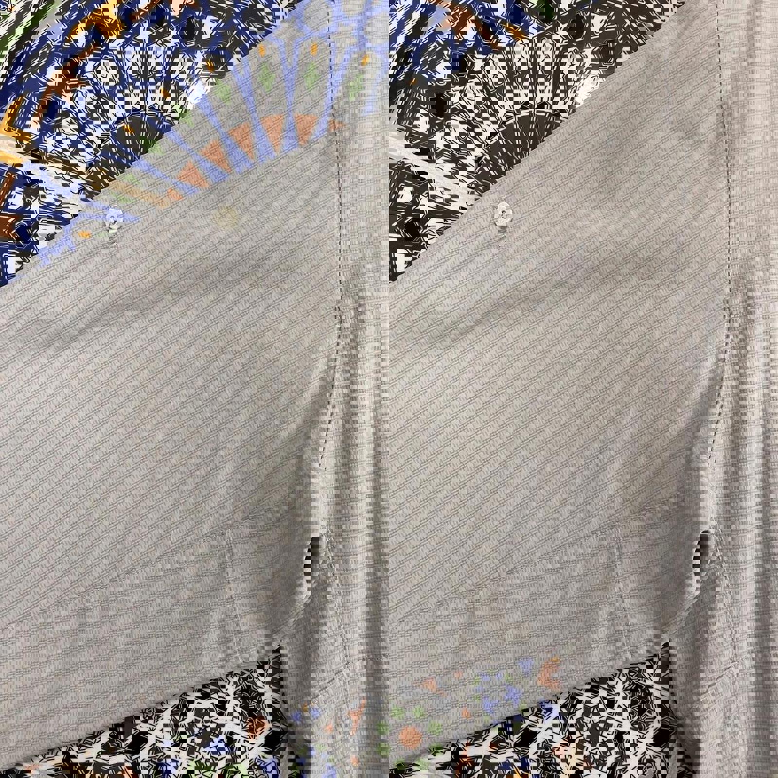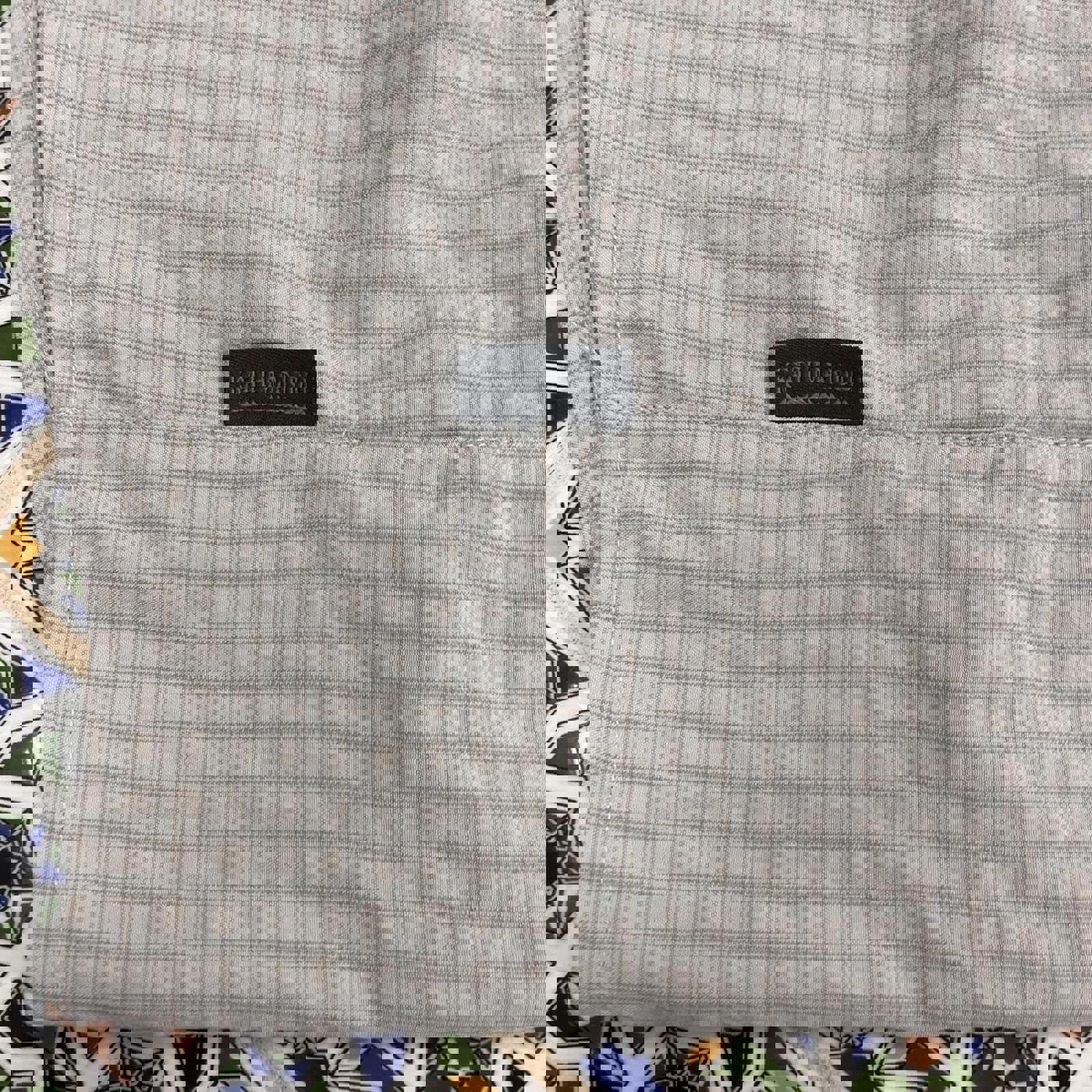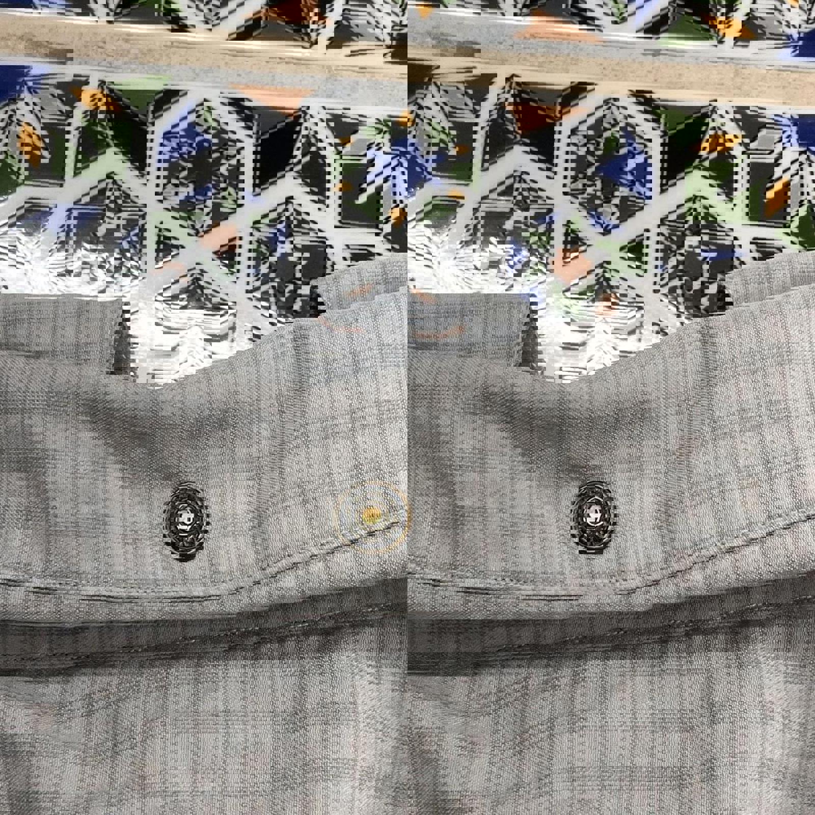 beige checkered kathmandu button up with zip-able pockets on both chests, kathmandu tab on the hip and detailed button on the collar