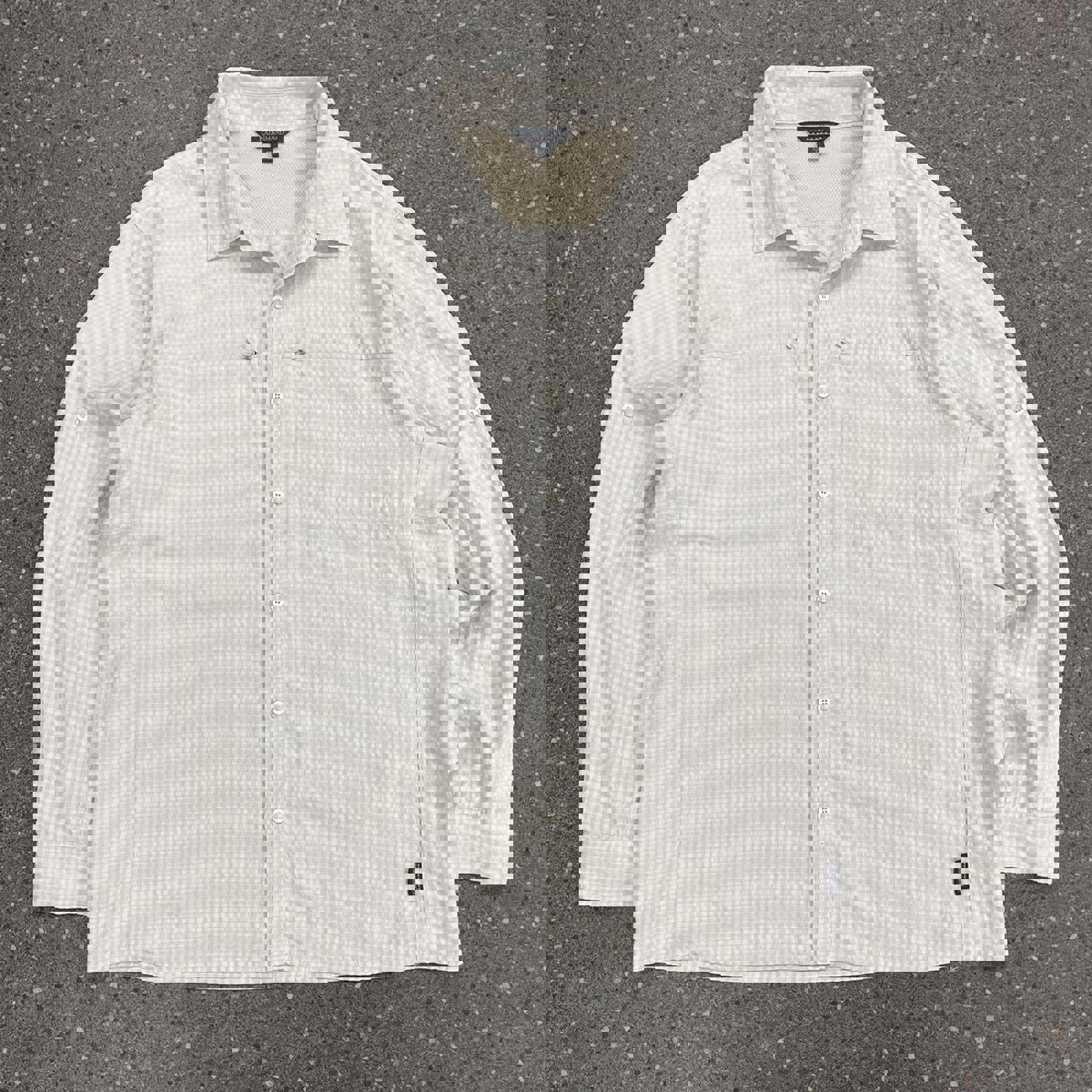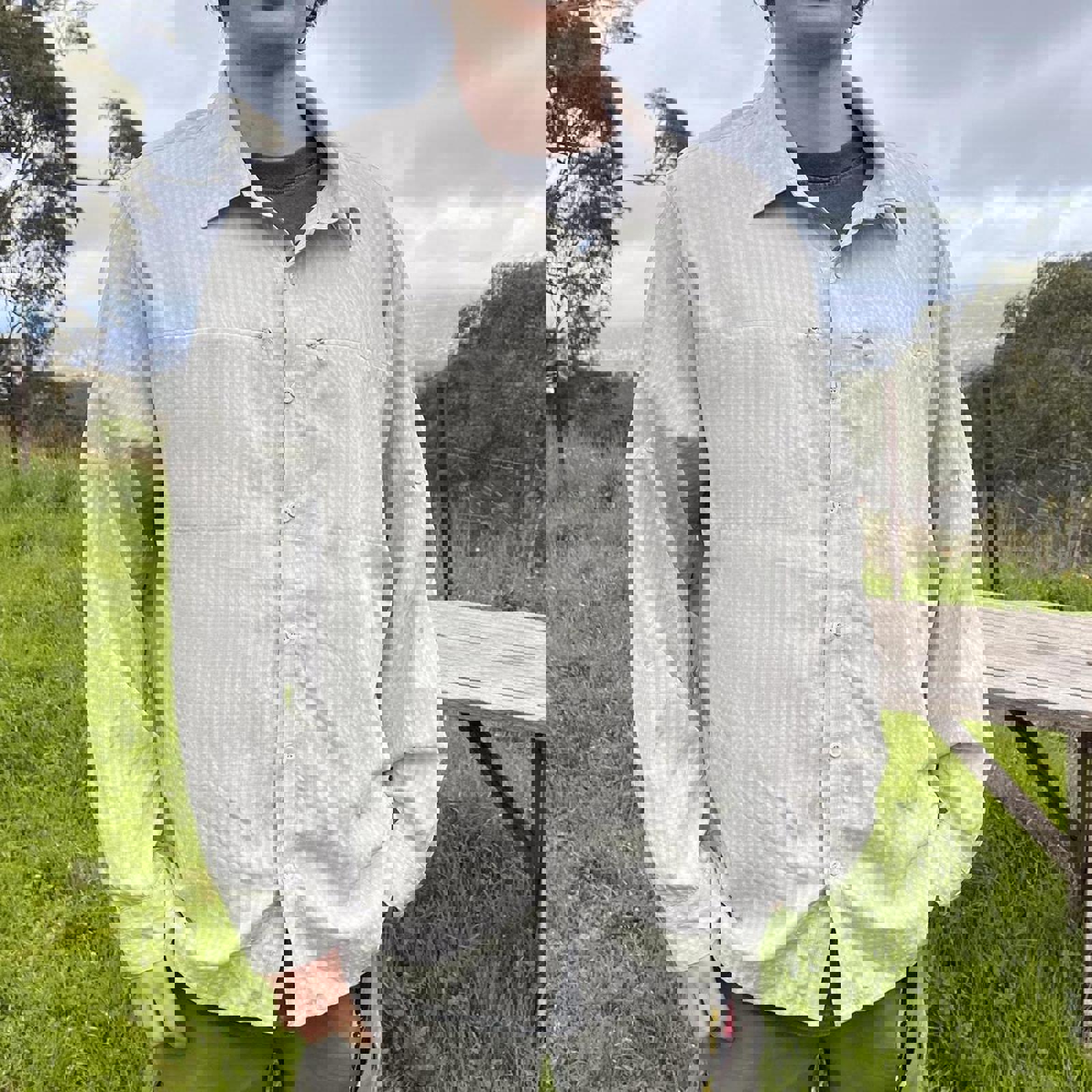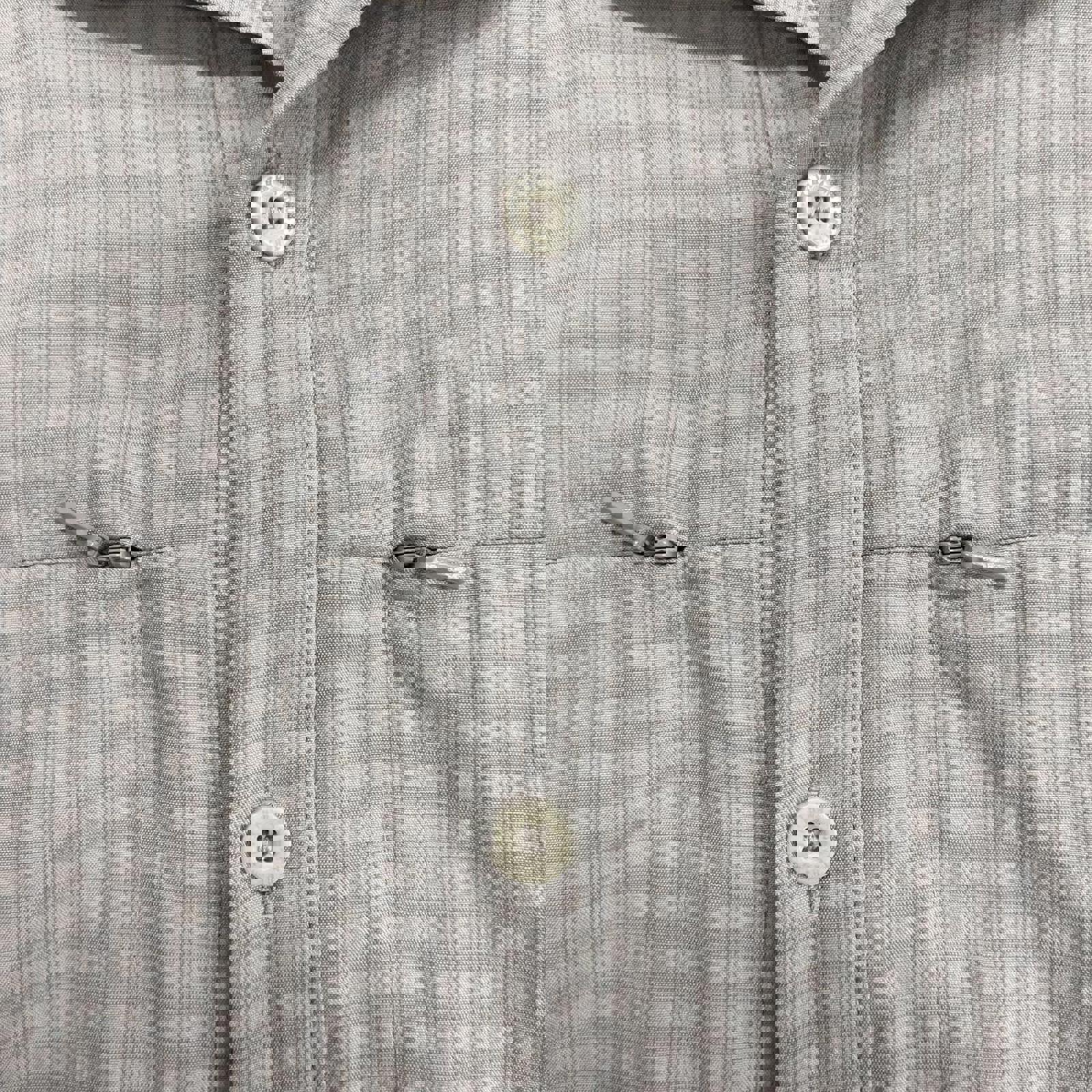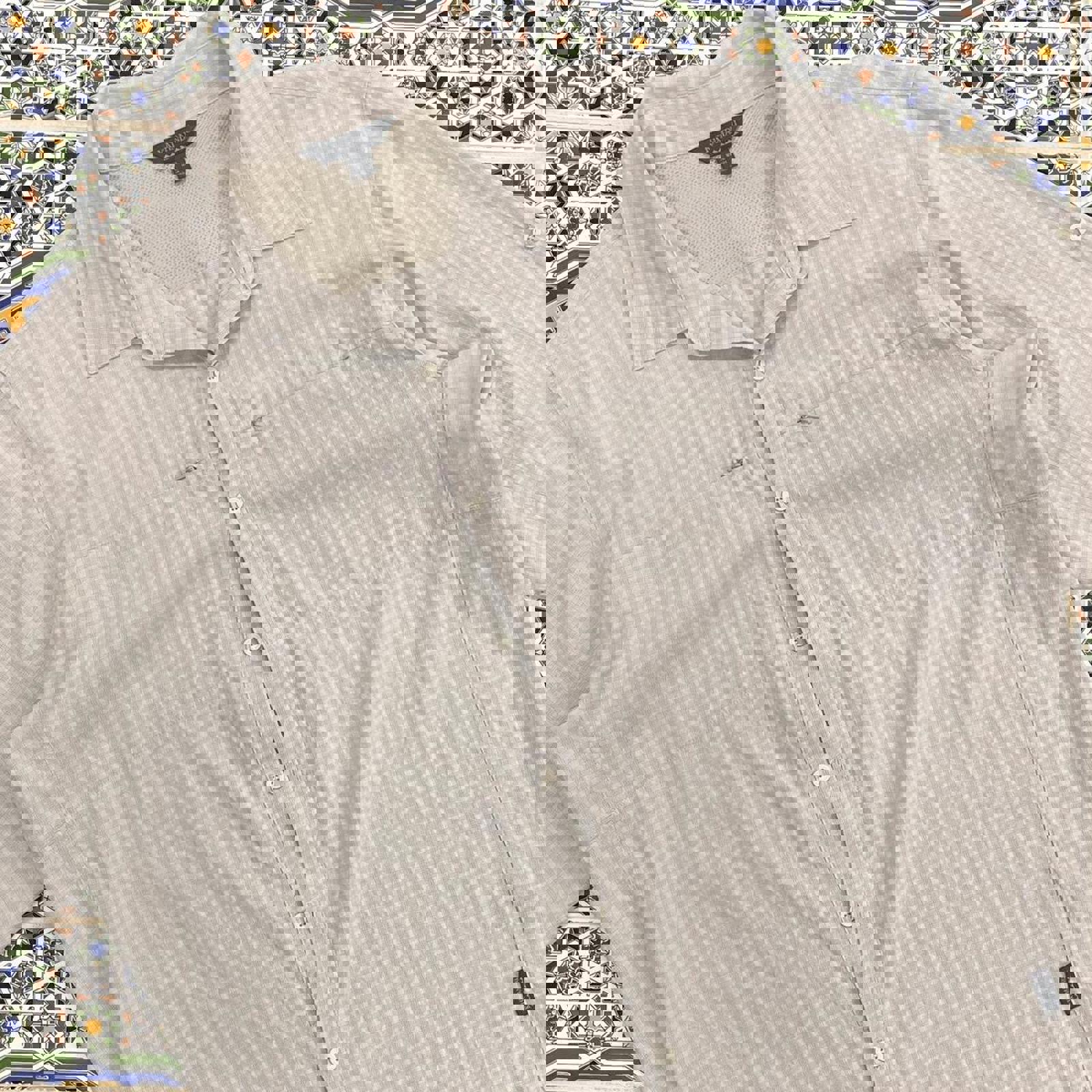 beige checkered kathmandu button up with zip-able pockets on both chests, kathmandu tab on the hip and detailed button on the collar