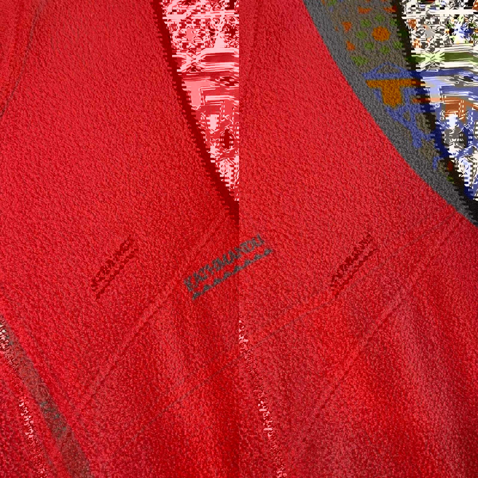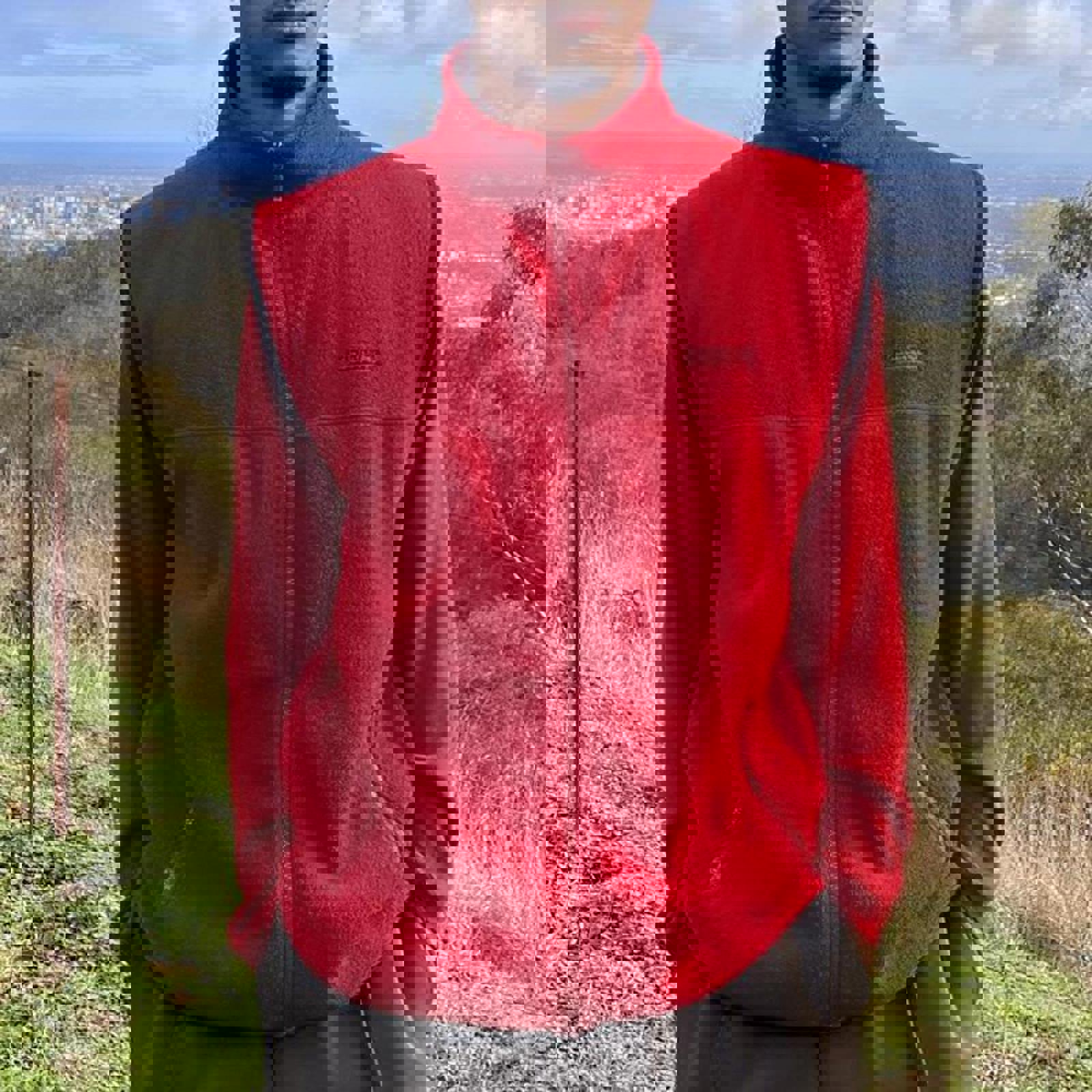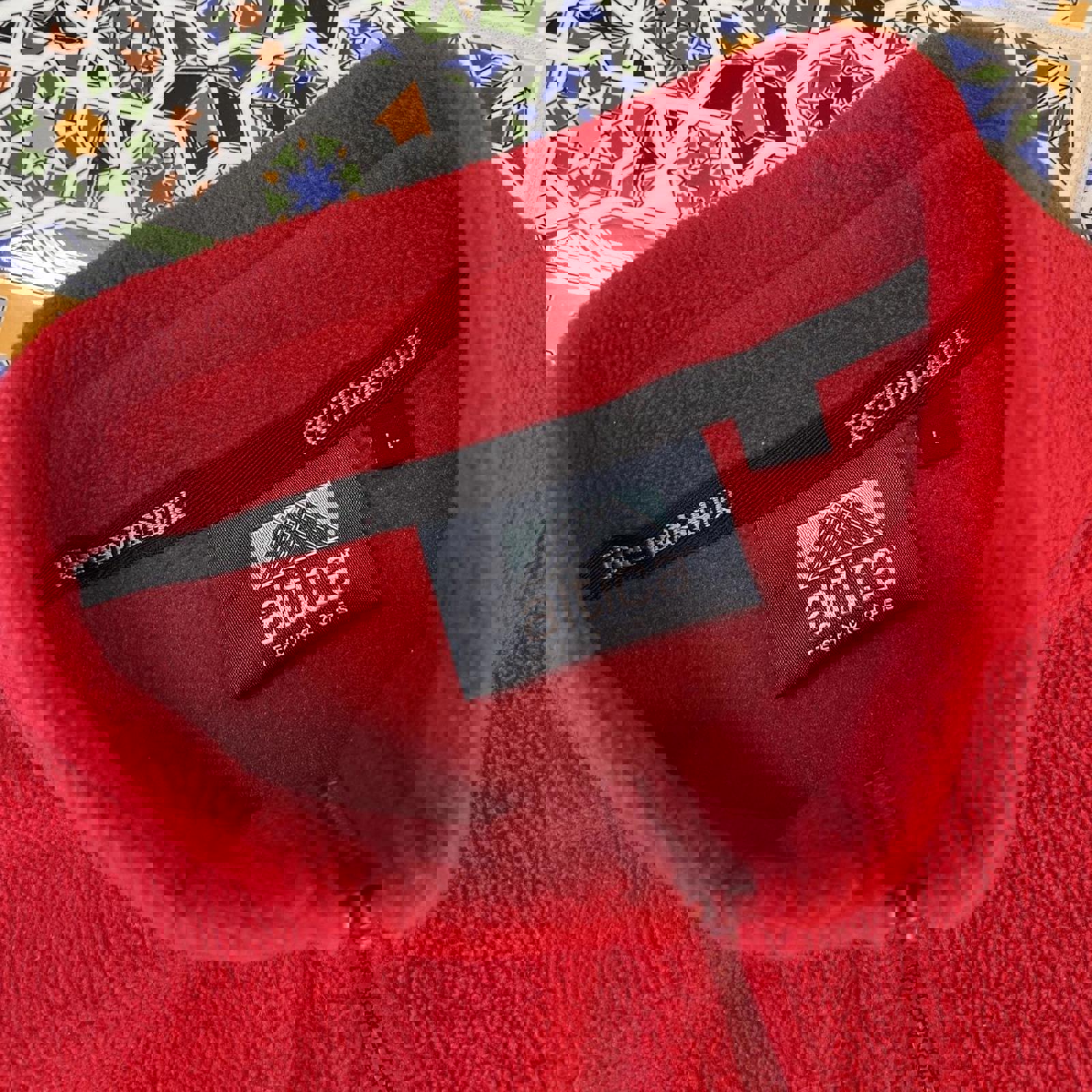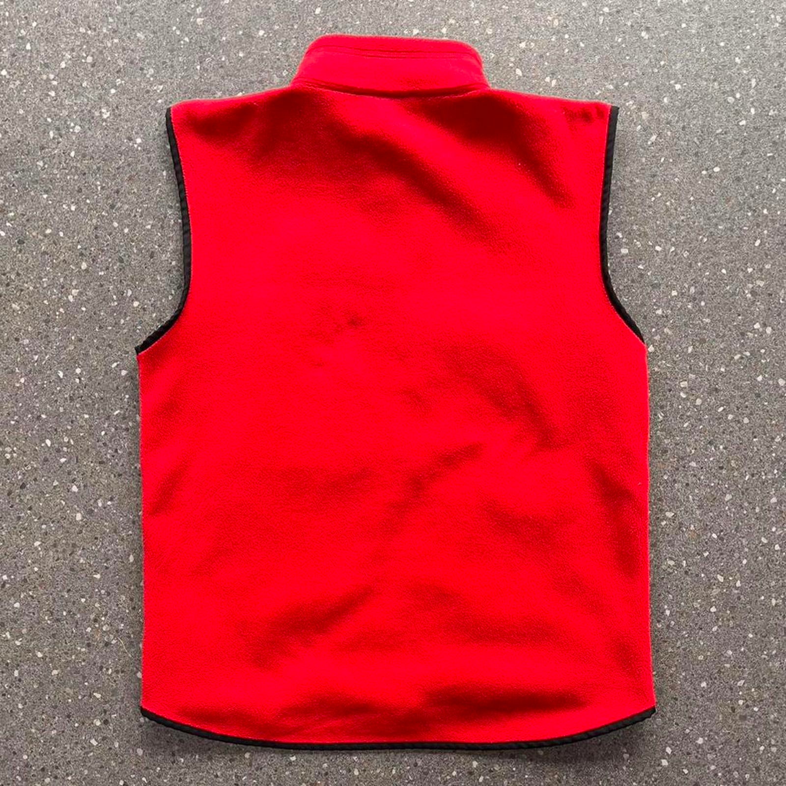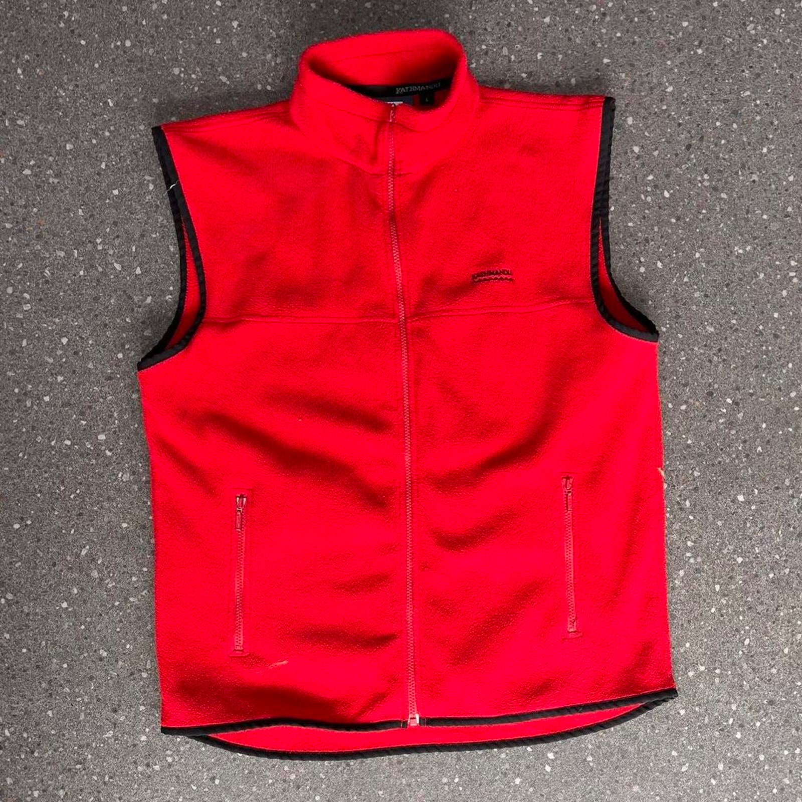 Red fleece Kathmandu altica tech vest with an embroidered black Kathmandu spell out on the chest and a black cuff around the arm holes