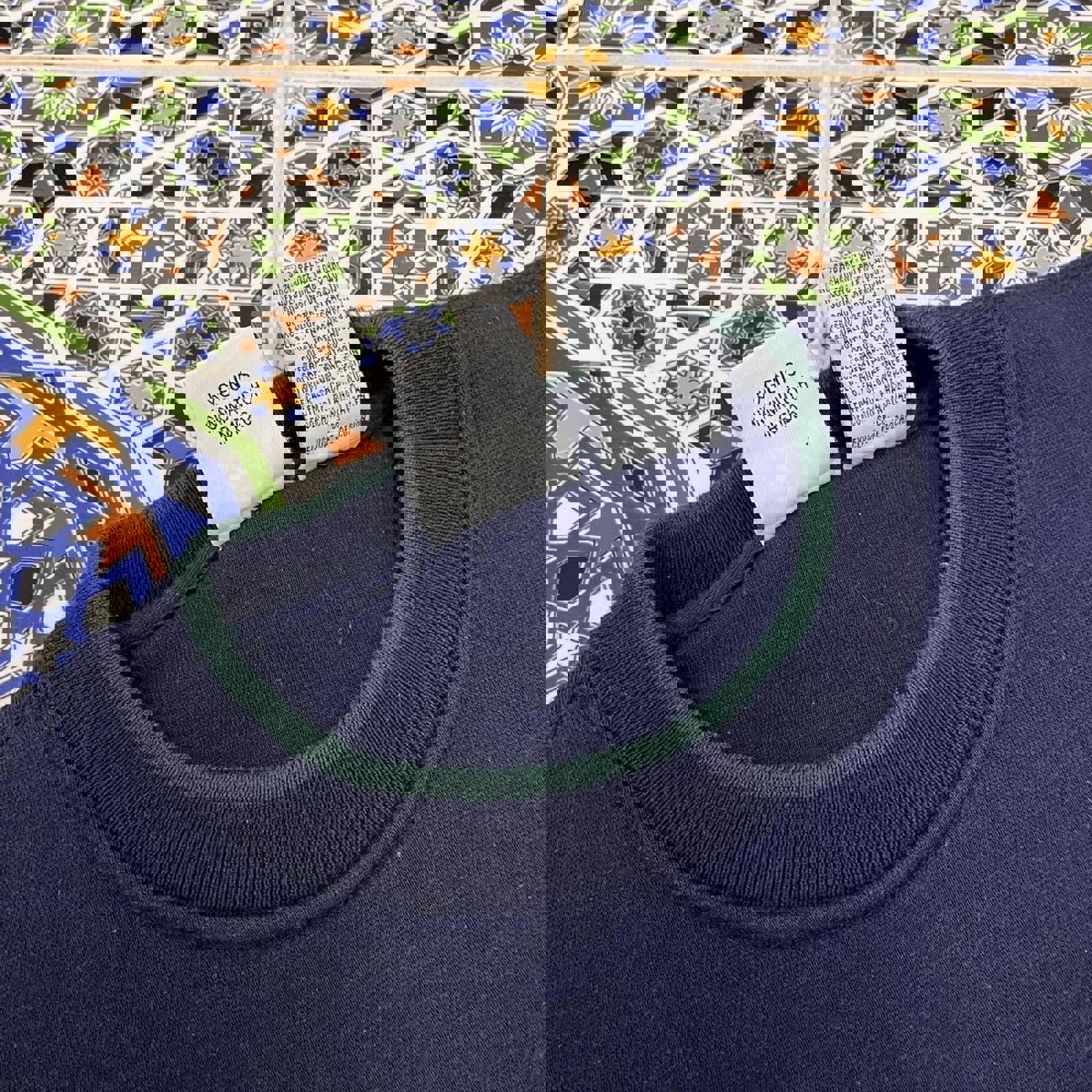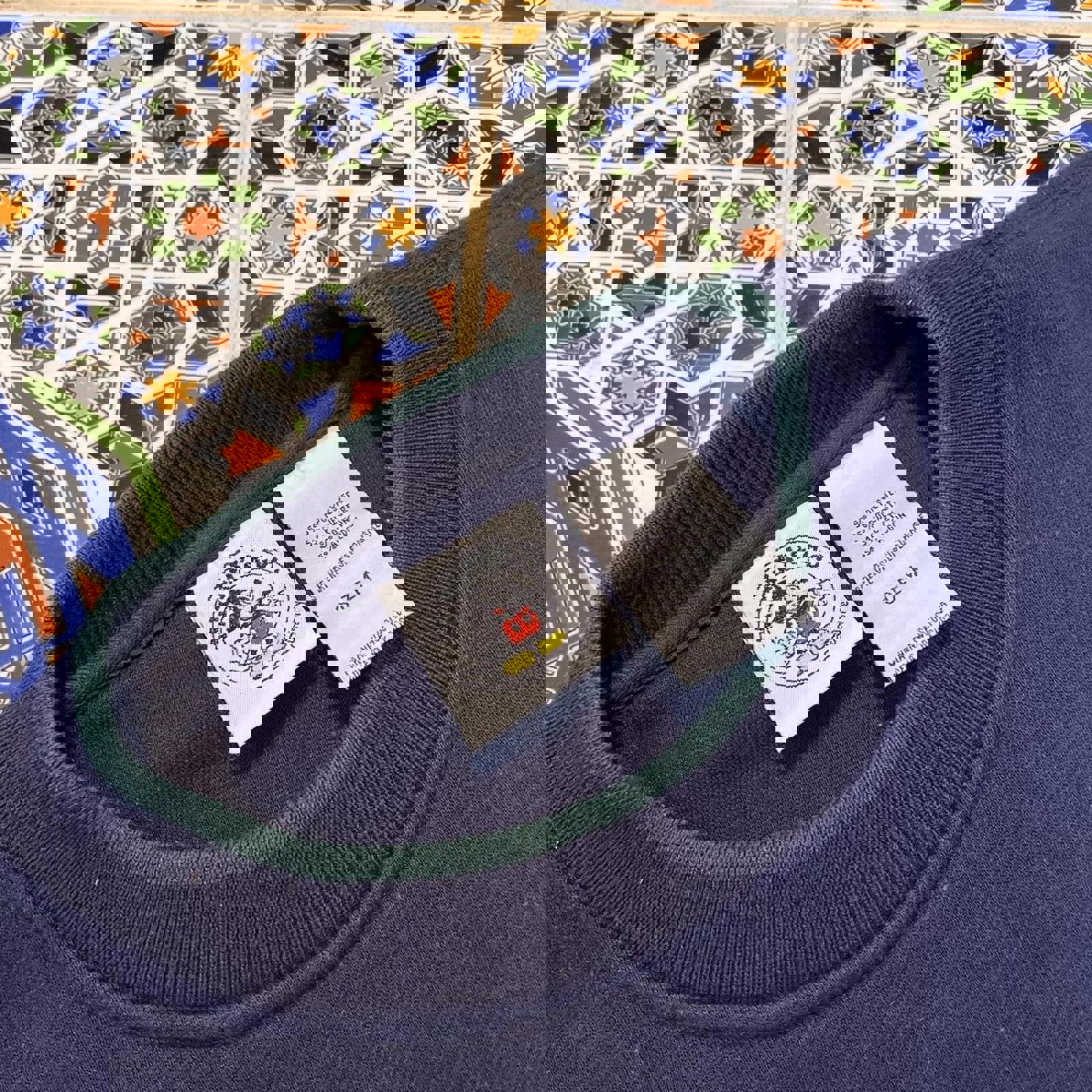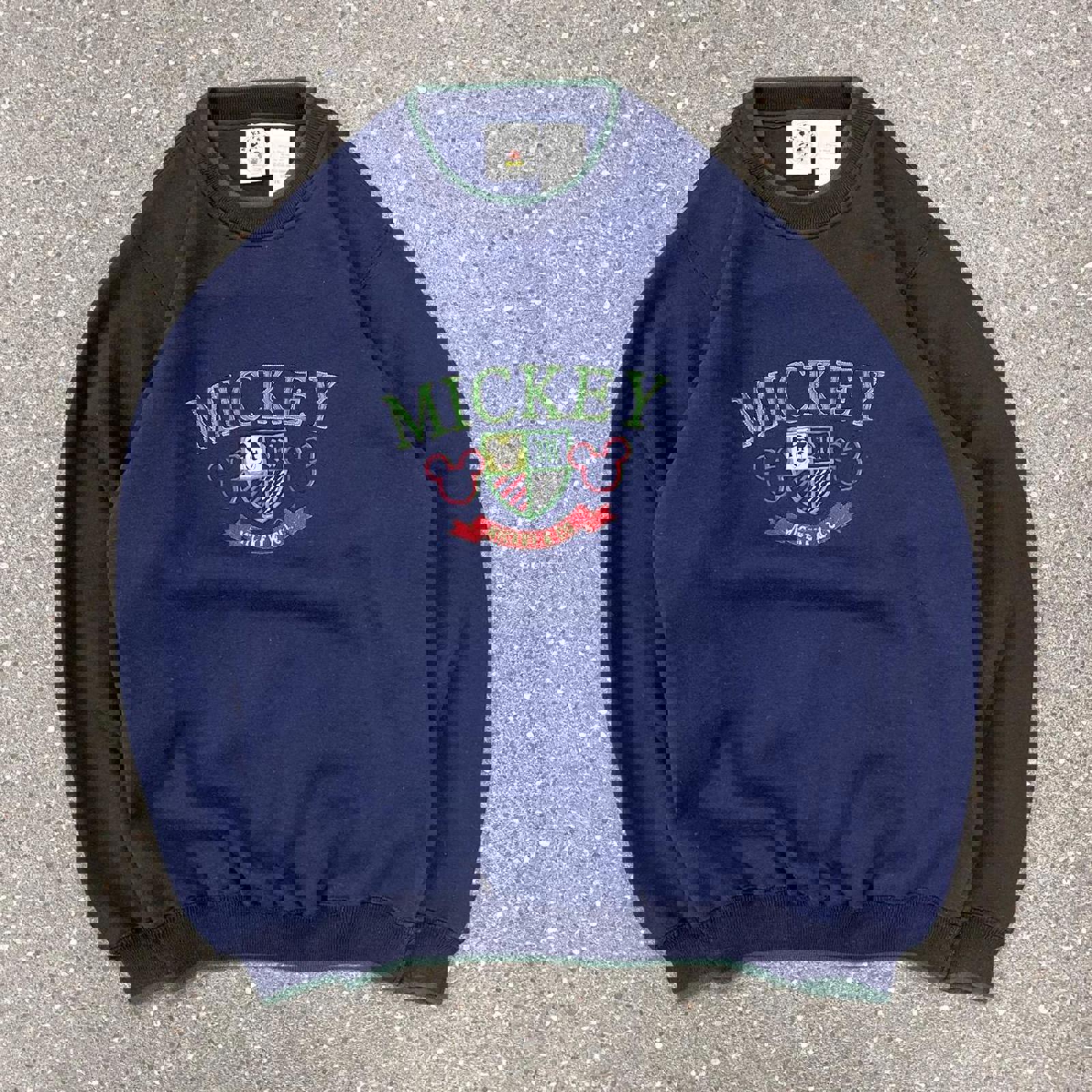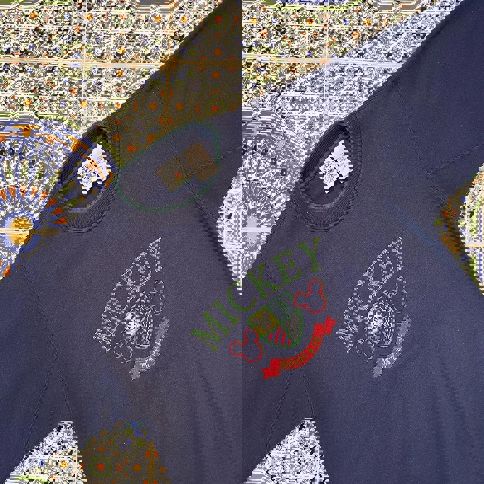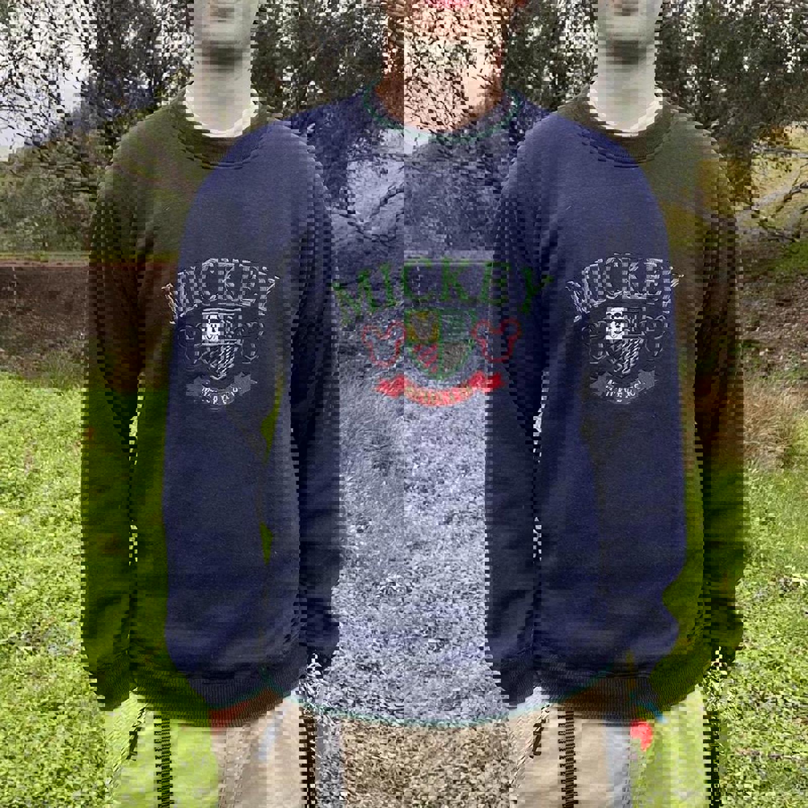 navy mickey & co disney mickey mouse sweatshirt with an all embroidered mickey chrest graphic in green, red and yellow on the front. also has green around cuffs