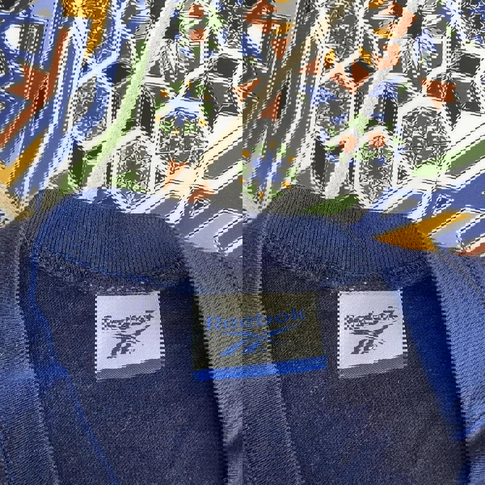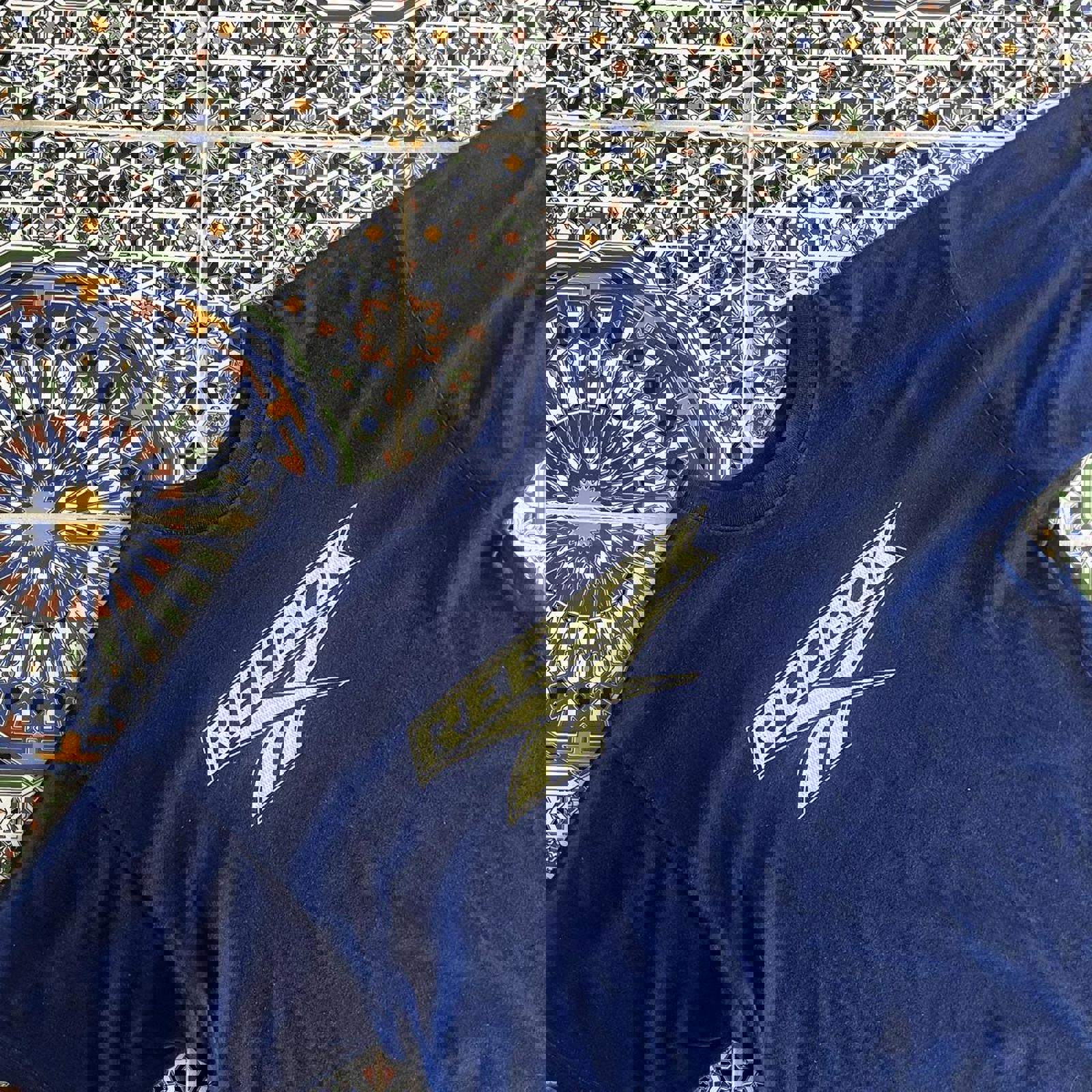 Navy Reebok tee with yellow and white Reebok graphic on the front