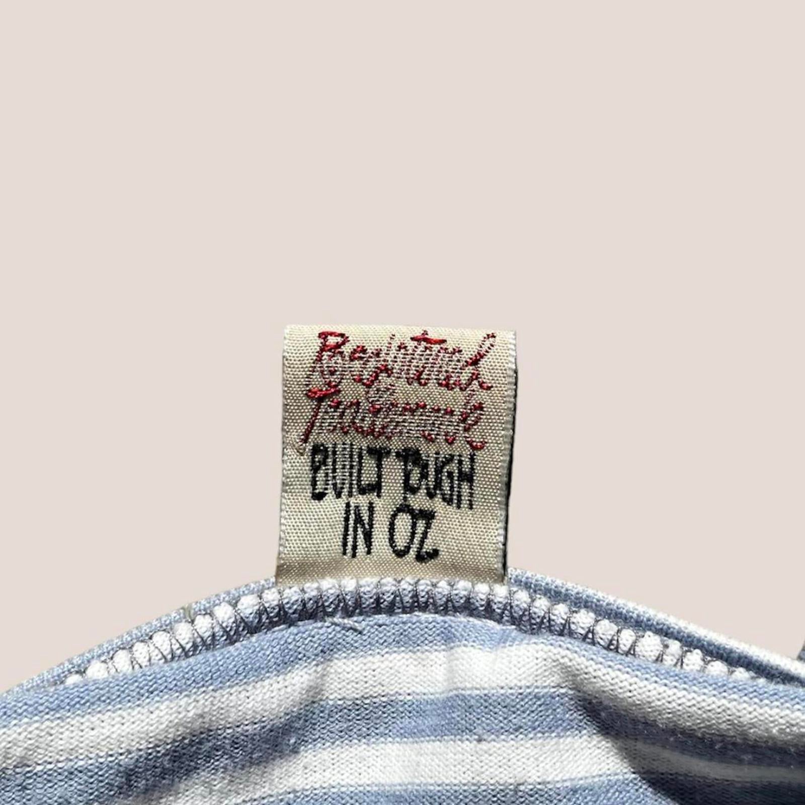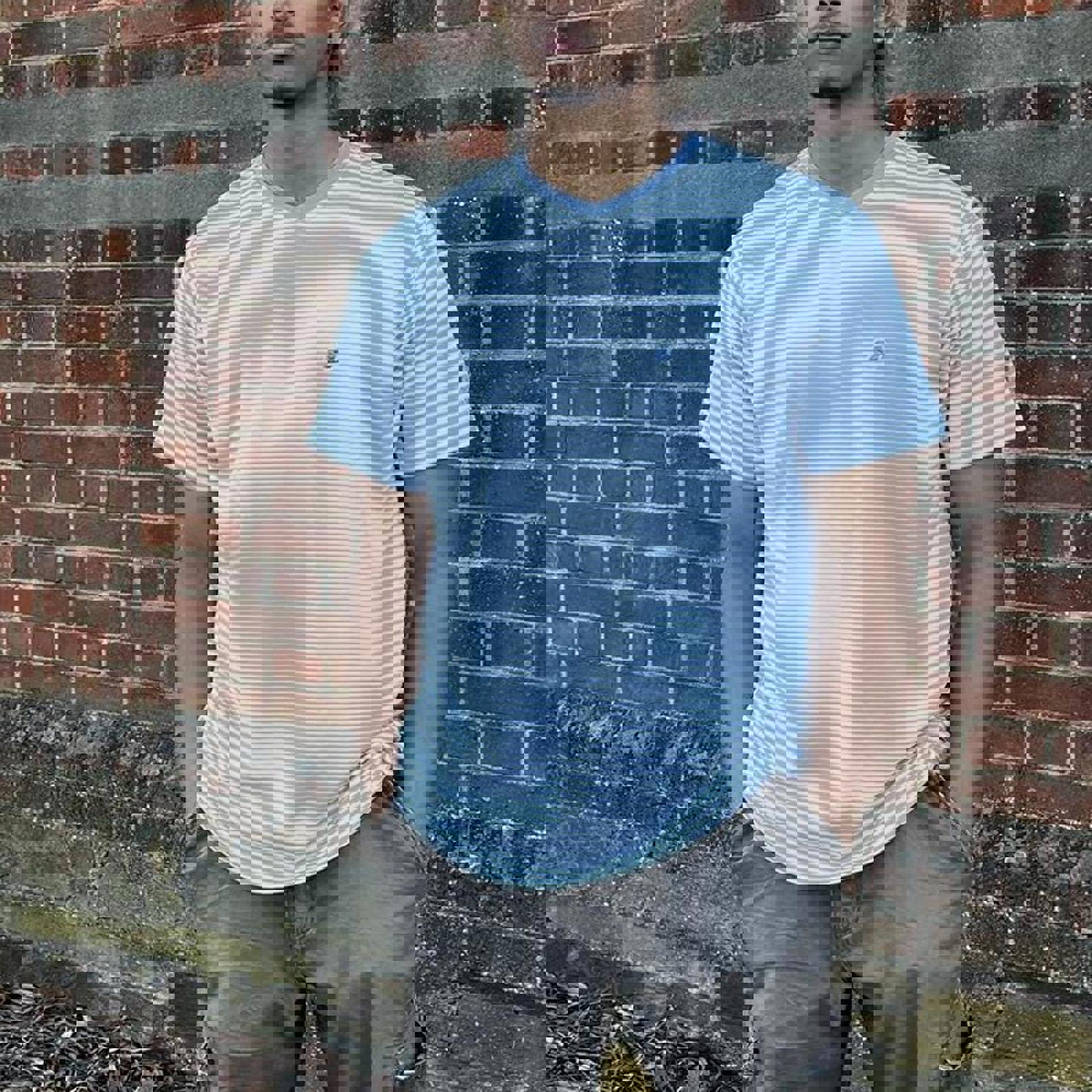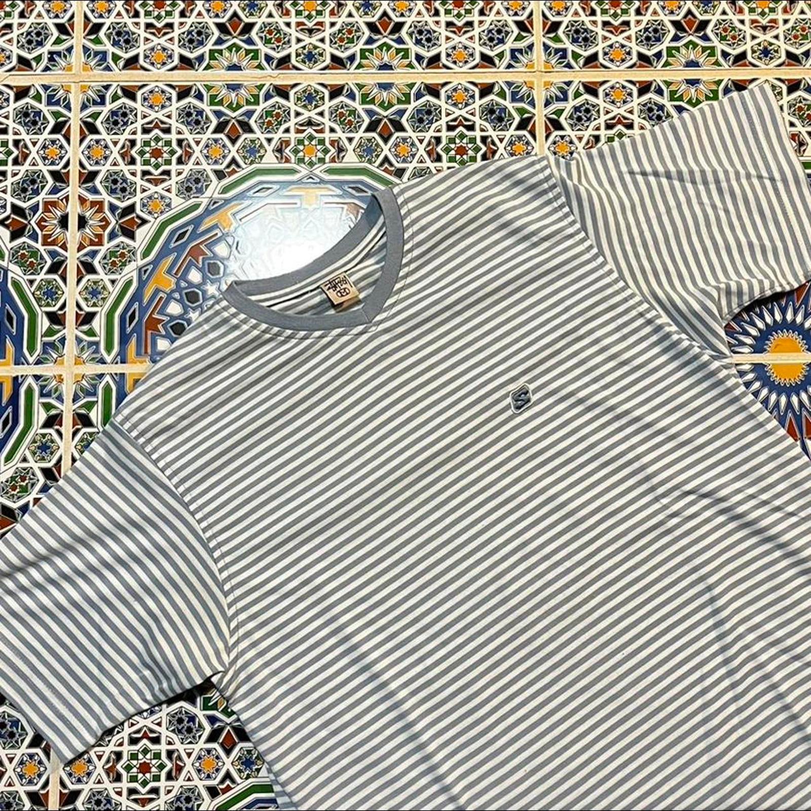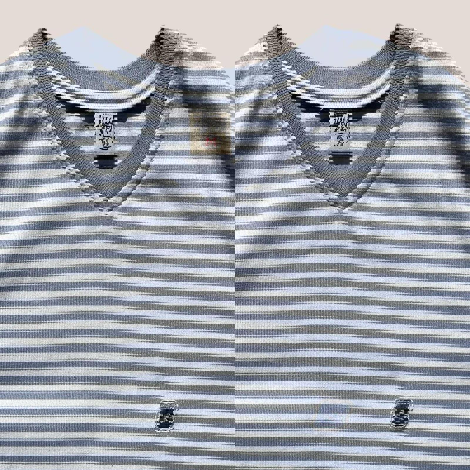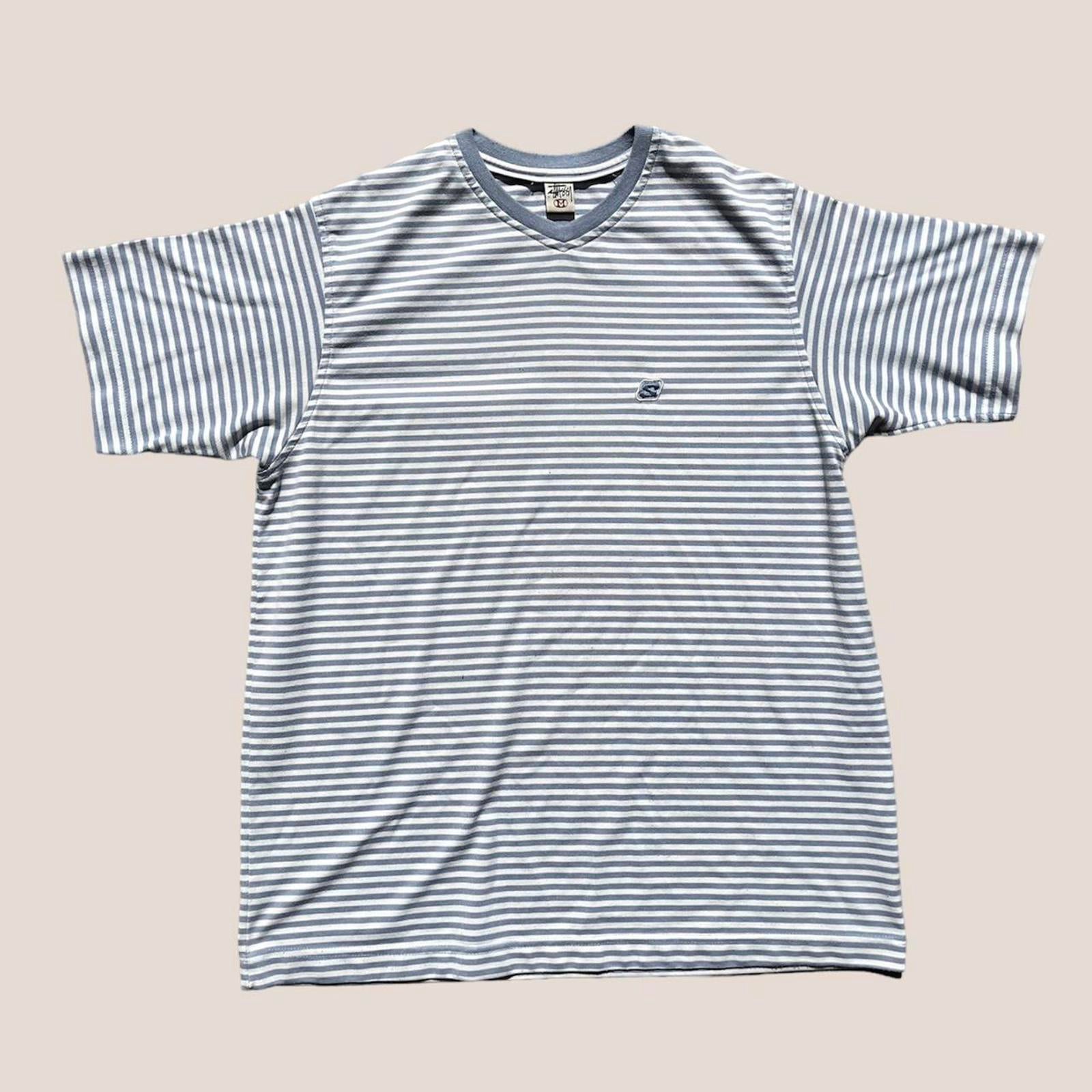 vintage Made in Australia v neck stussy tee with baby blue and white stripes and embroidered stussy badge on chest