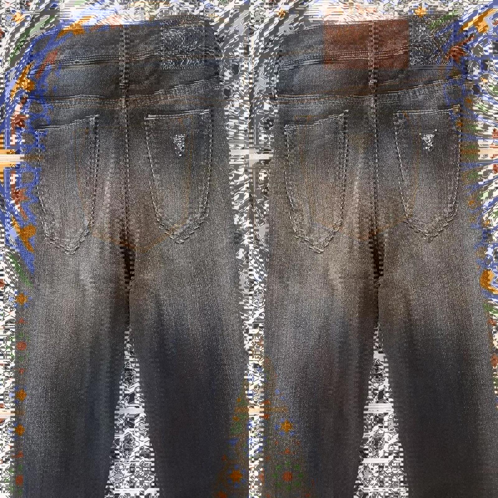 faded blue / grey wash guess beverly skinny denim jeans with detailed buttons, zips at the ankles, detailed insides and a gem stone guess patch on the back pocket