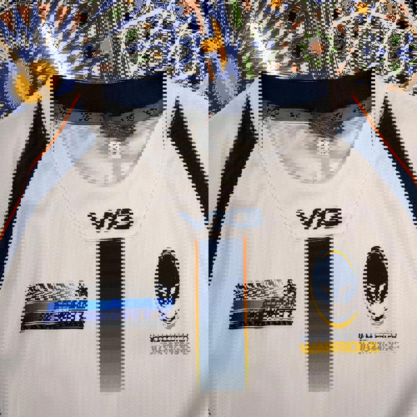 White and navy VX3 Worcester Warriors English rugby jersey