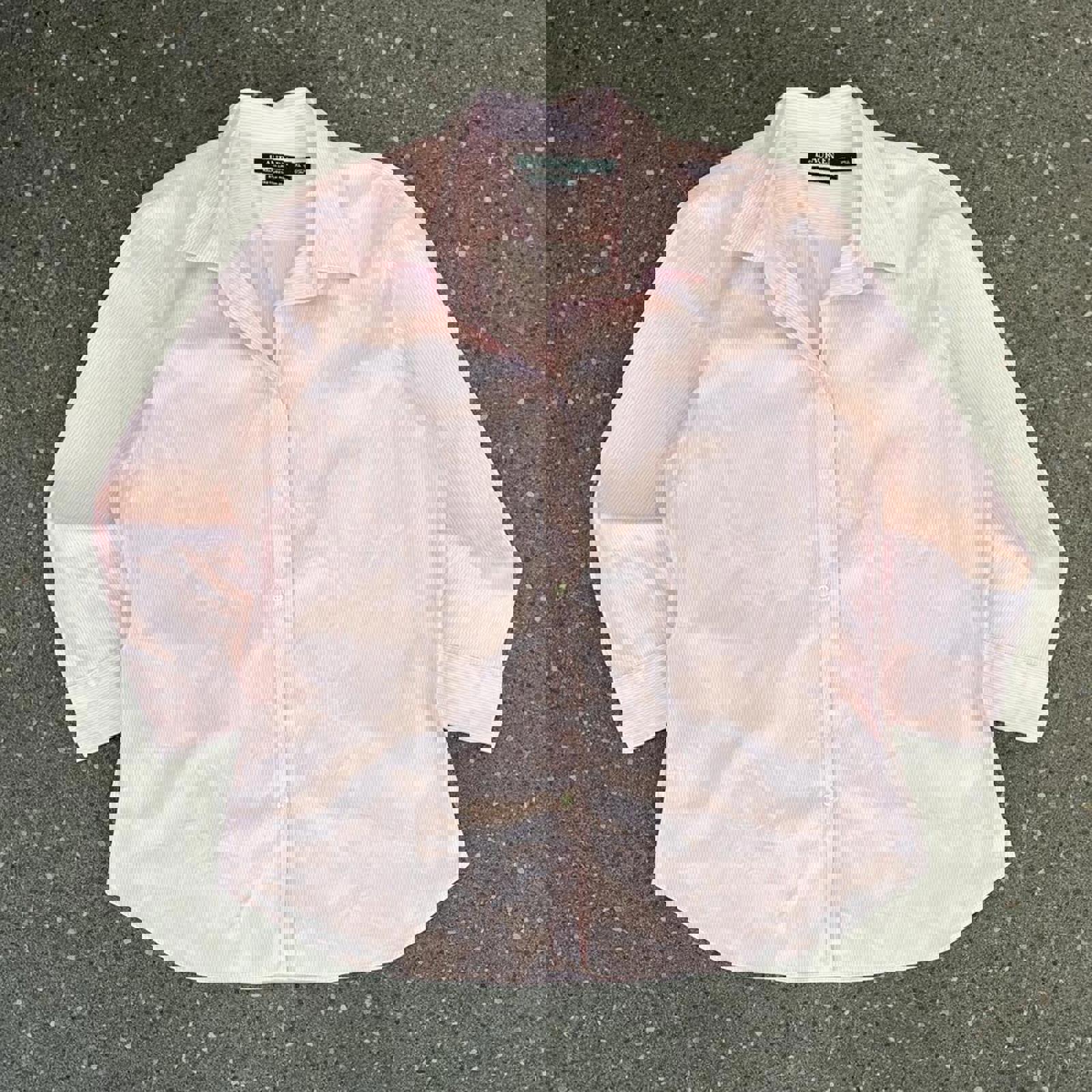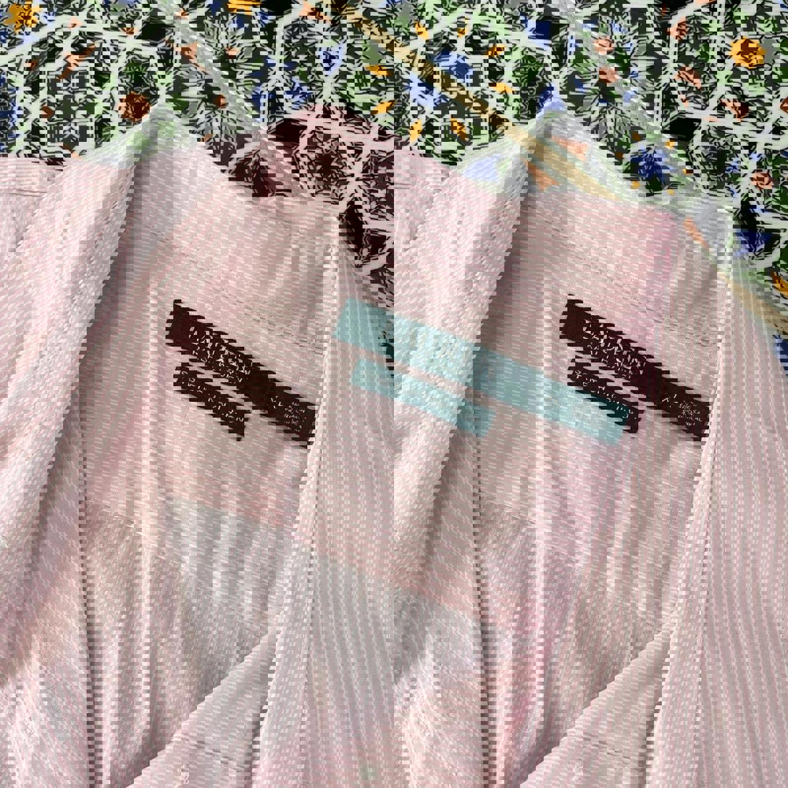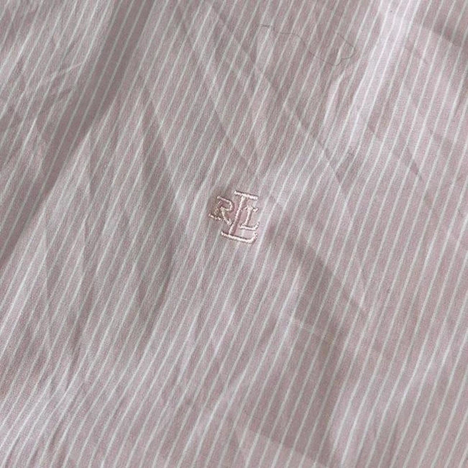 Pink and white striped women’s Lauren by Ralph Lauren button up shirt with an embroidered RLL on the chest