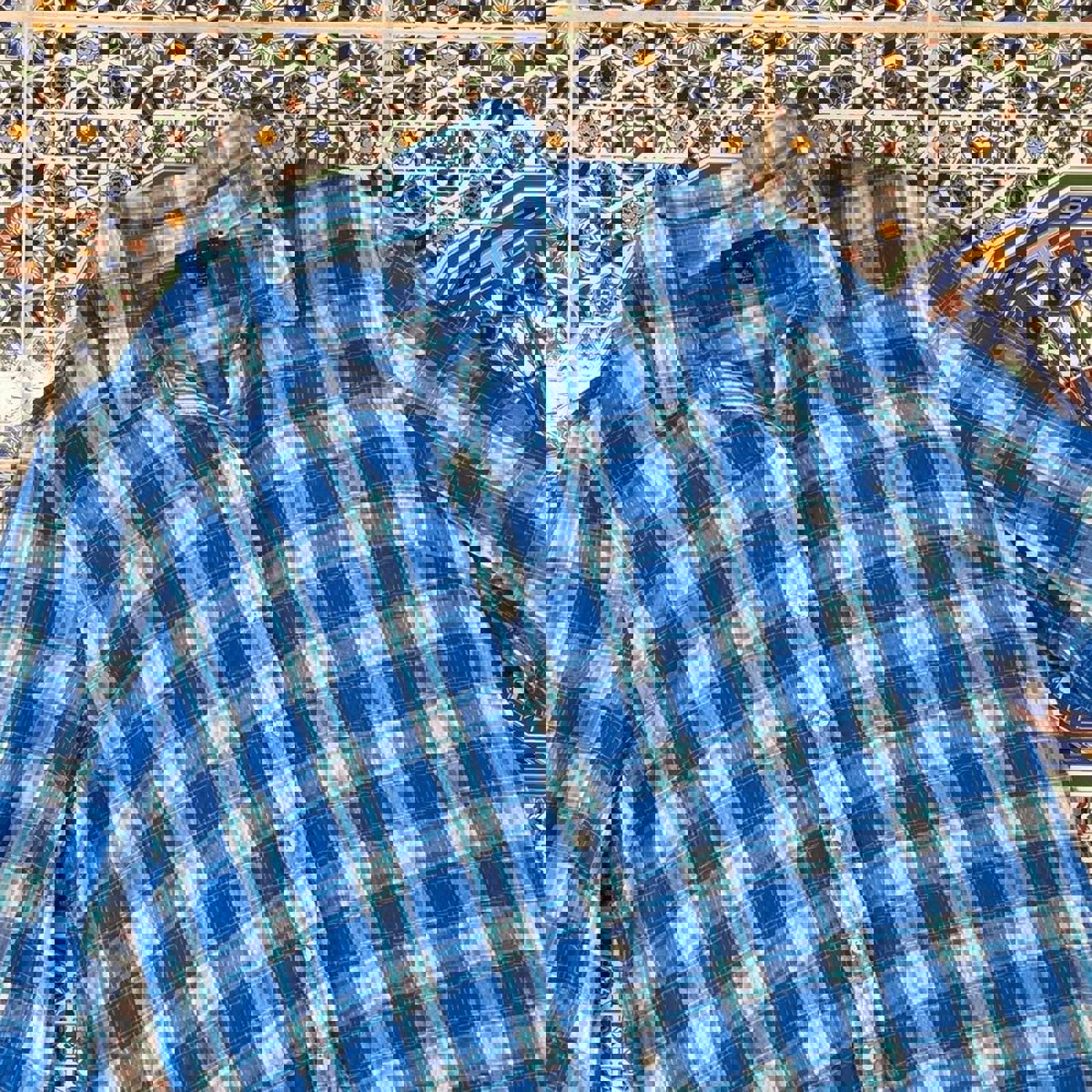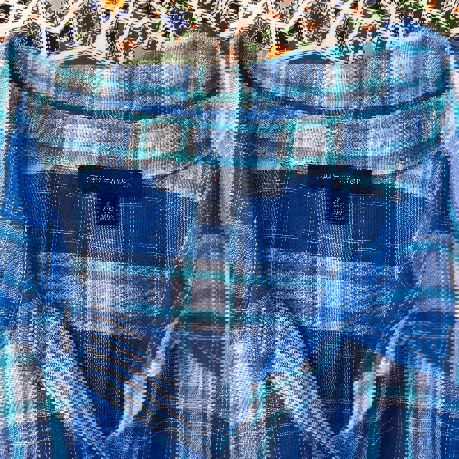 Blue, green and white checkered women’s Tommy Hilfiger flannel button up shirt