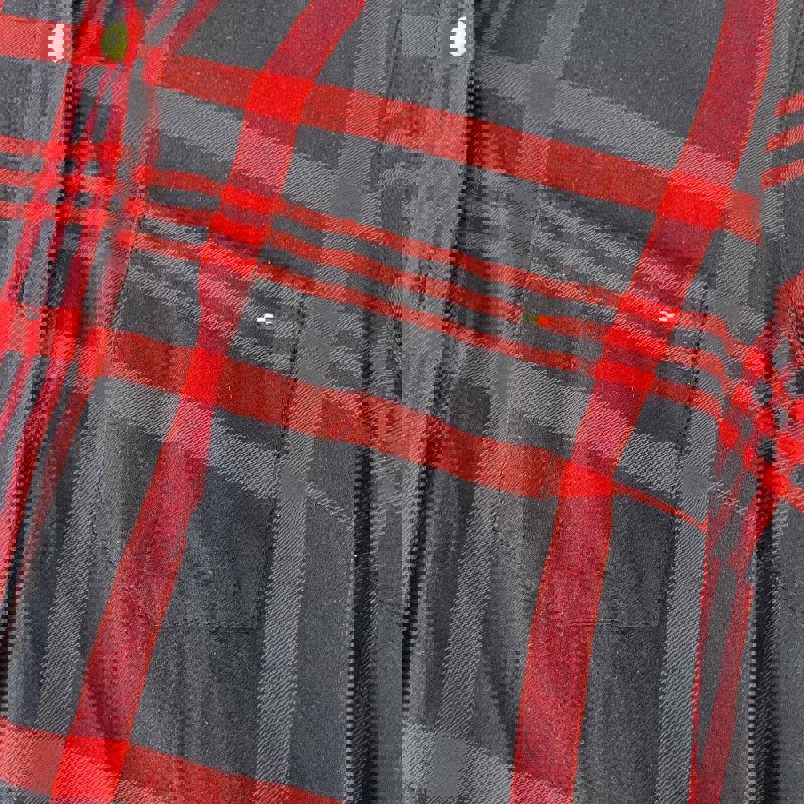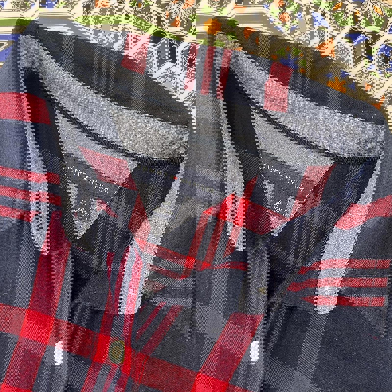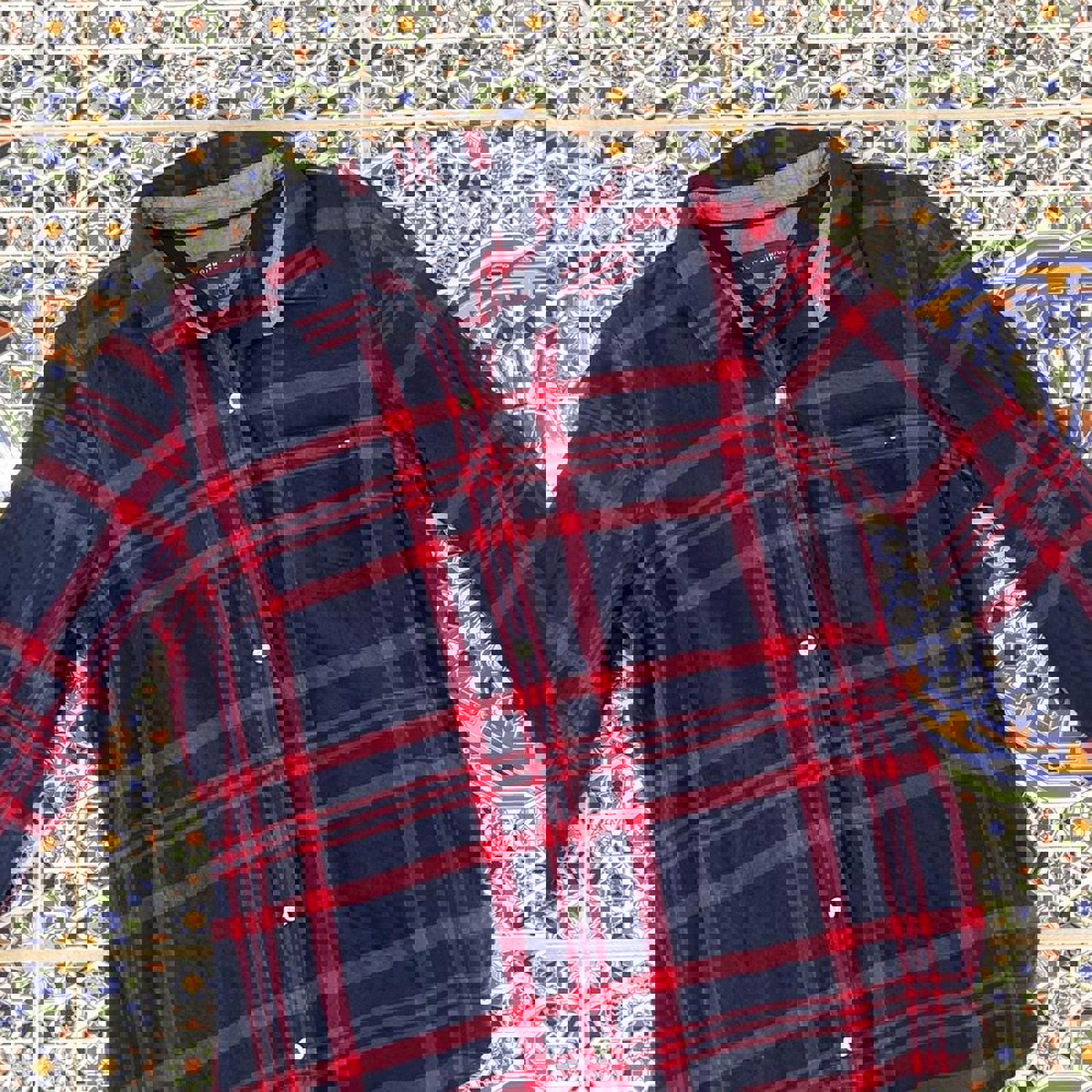Navy and red checkered women’s Tommy Hilfiger flannel button up shirt with an embroidered flag on the chest