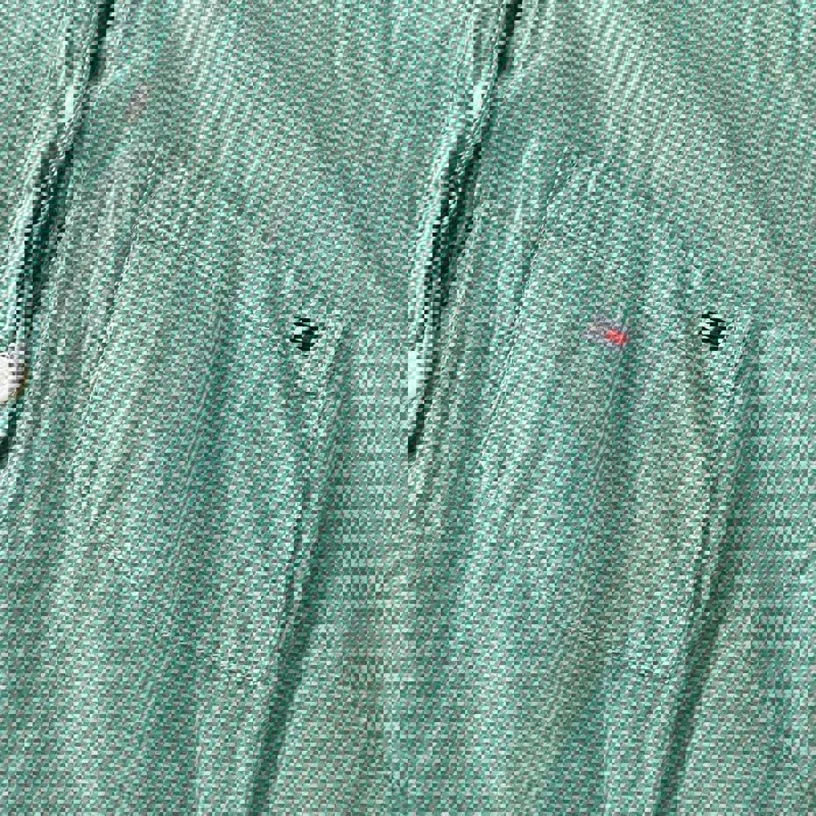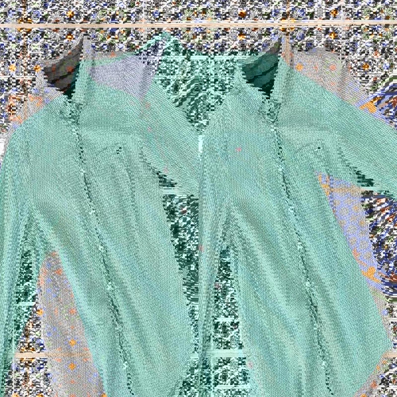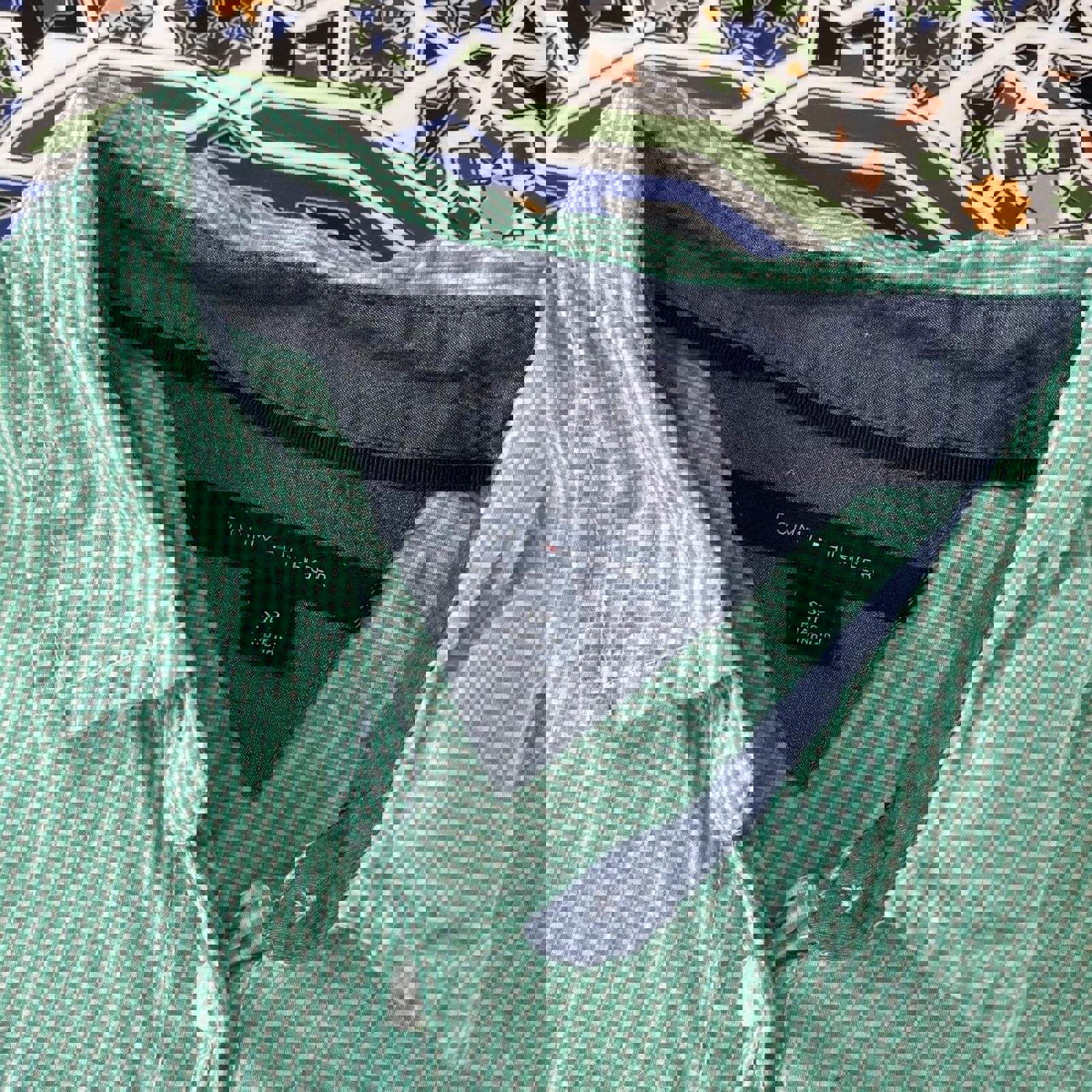 White and green checkered women’s Tommy Hilfiger button up shirt with an embroidered flag on the chest