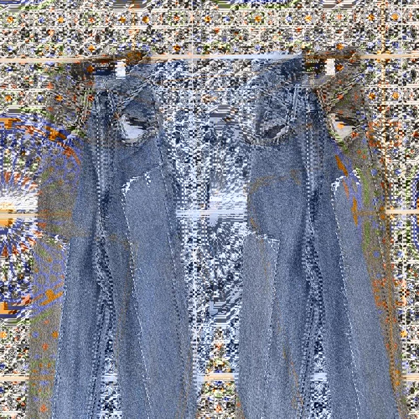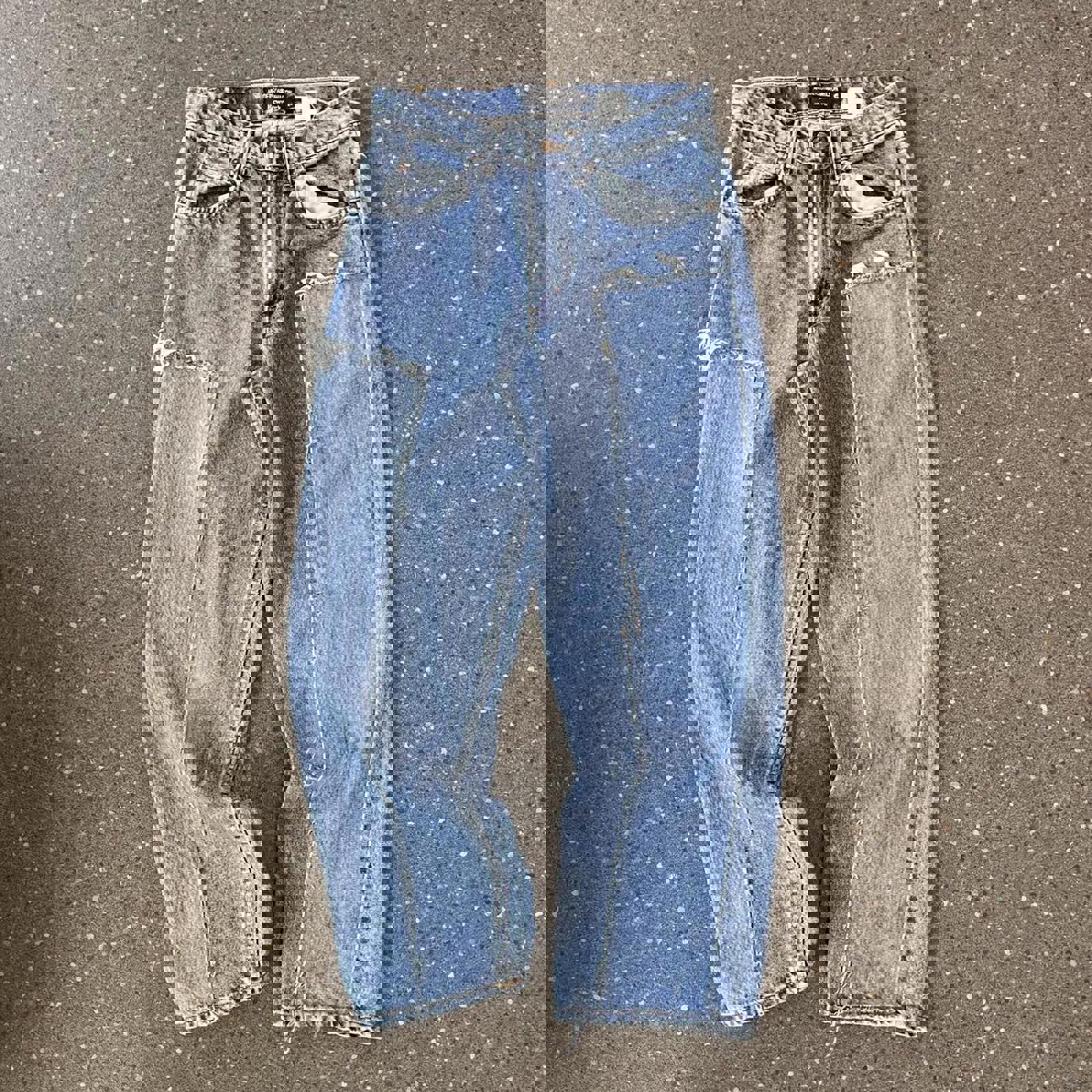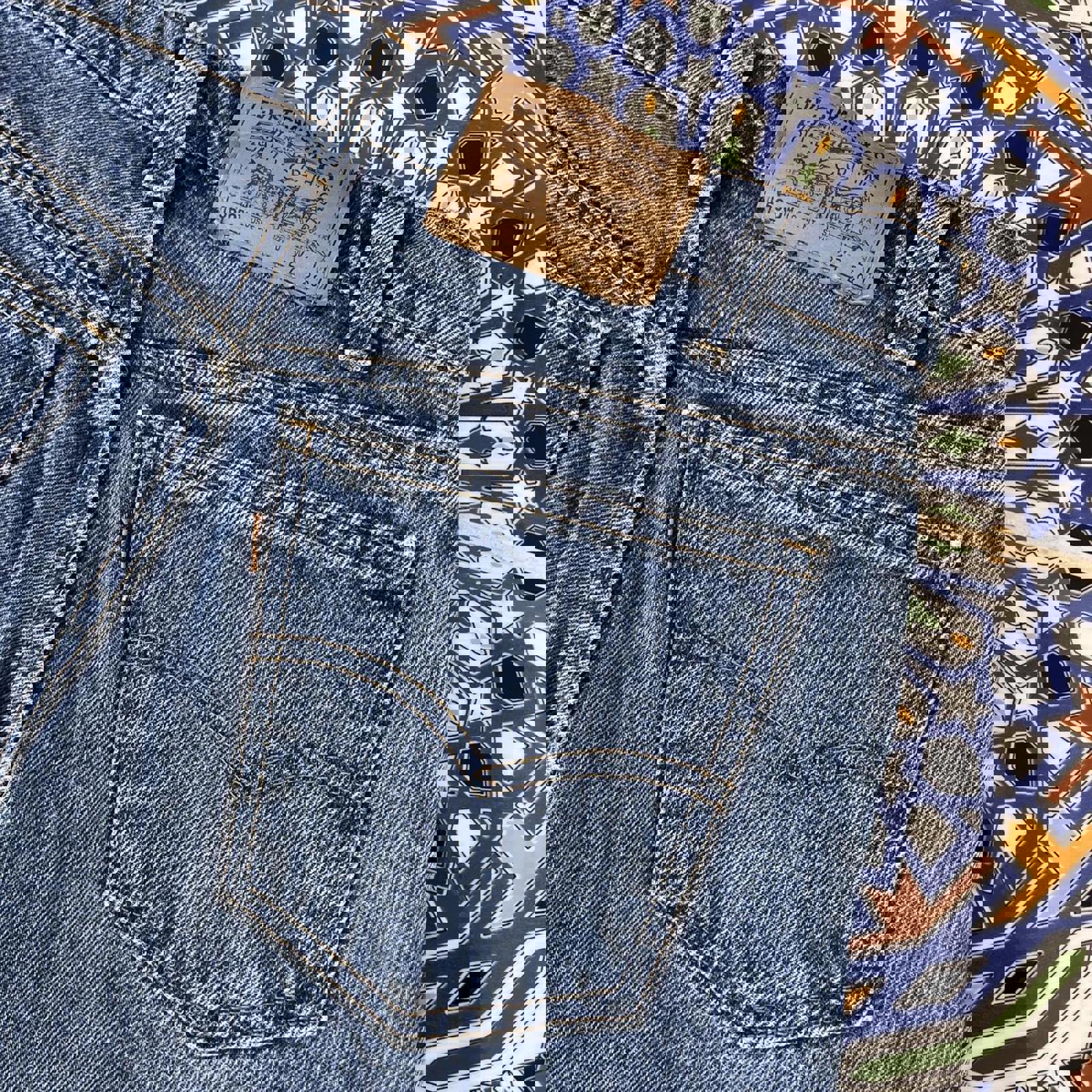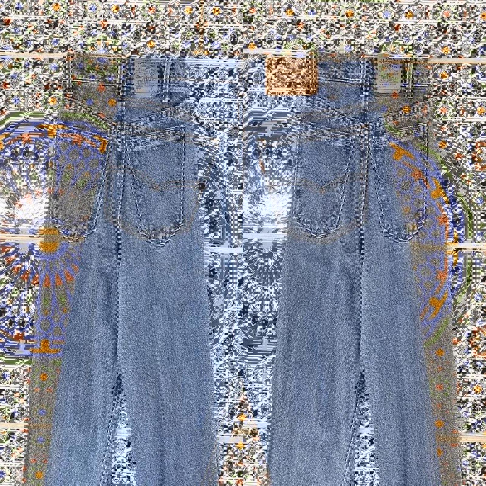 Light blue wash high waisted up-cycled women’s denim jeans with a strip of another layer of denim on each leg