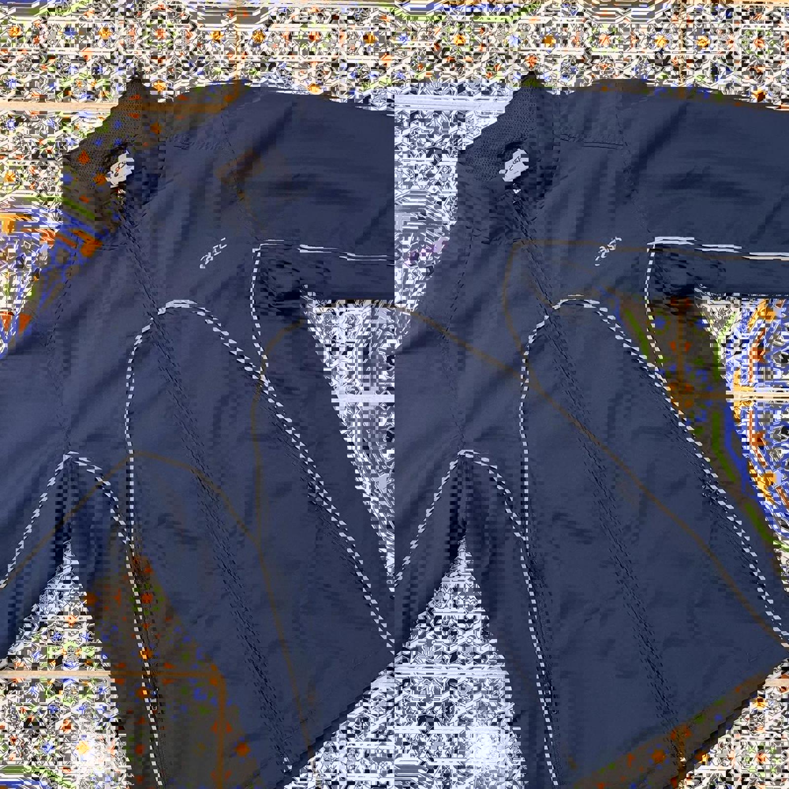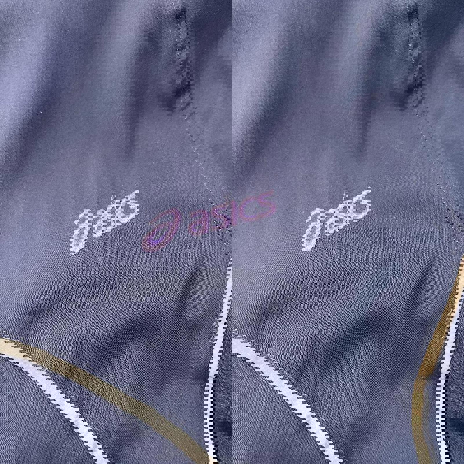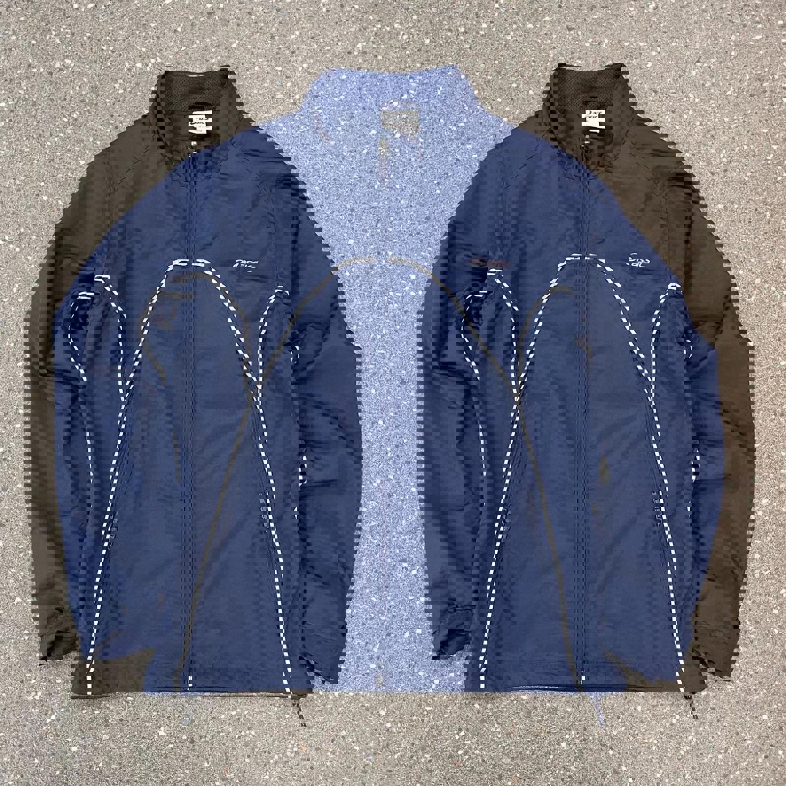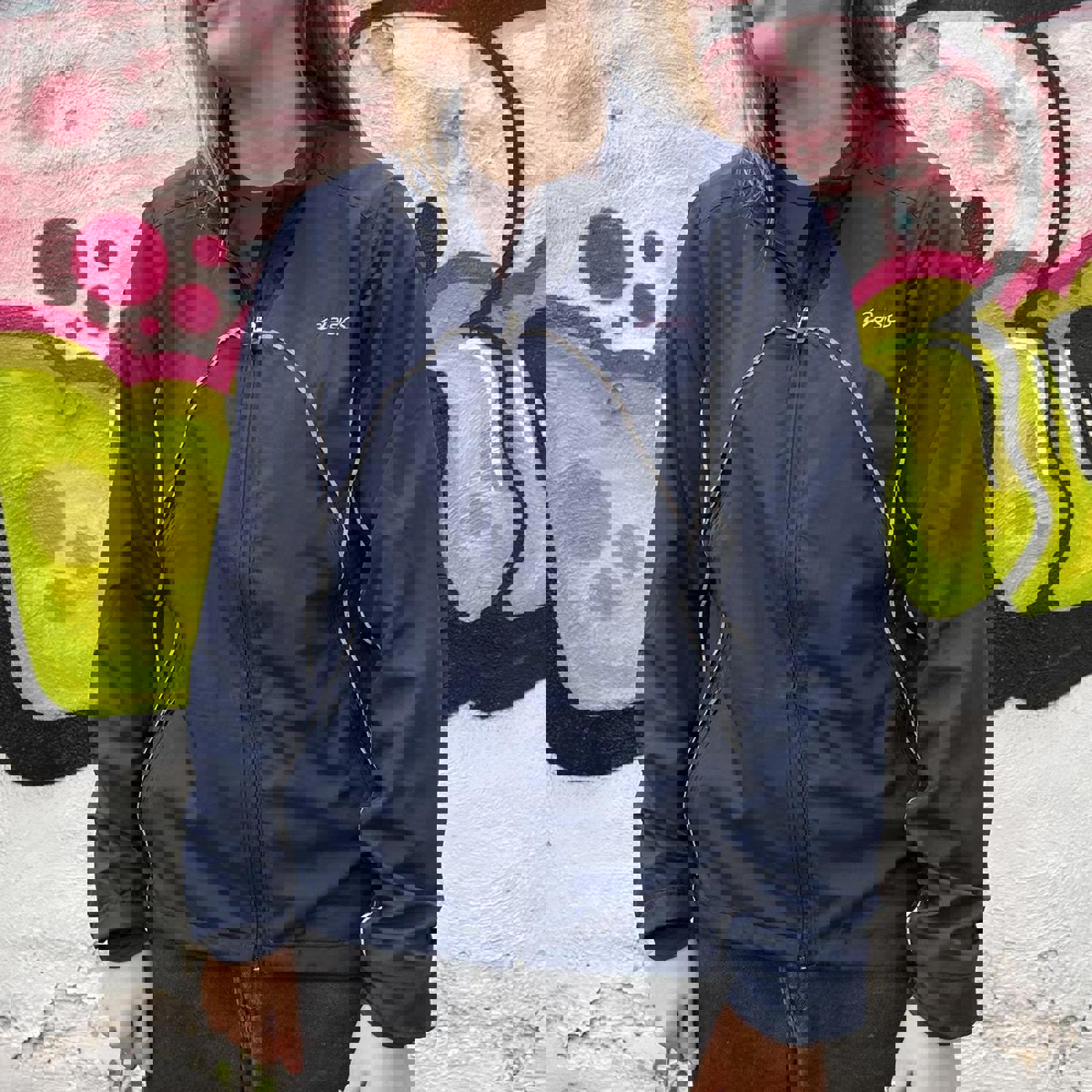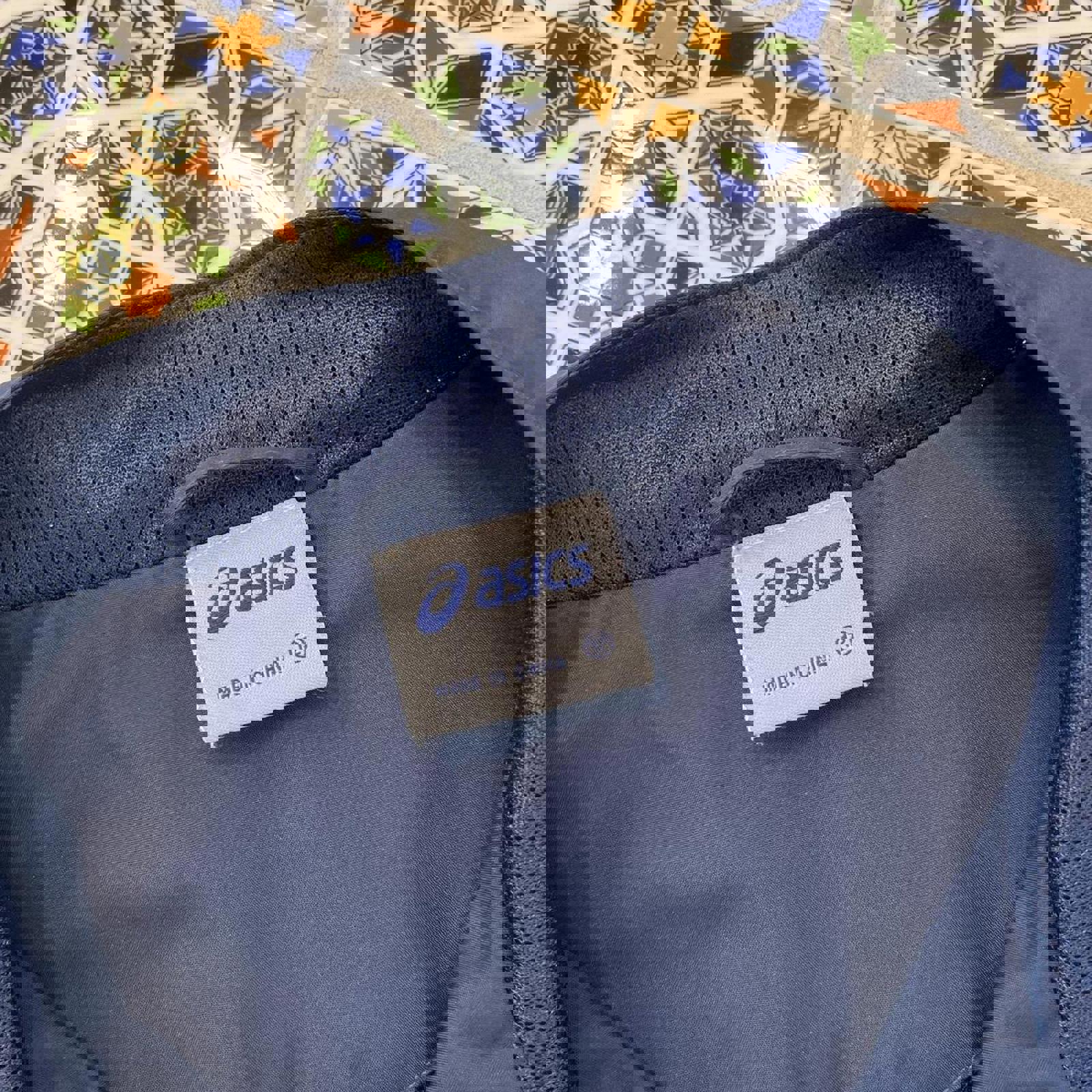 navy with silver piping asics jacket with zip-able pockets and an embroidered purple logo on the chest