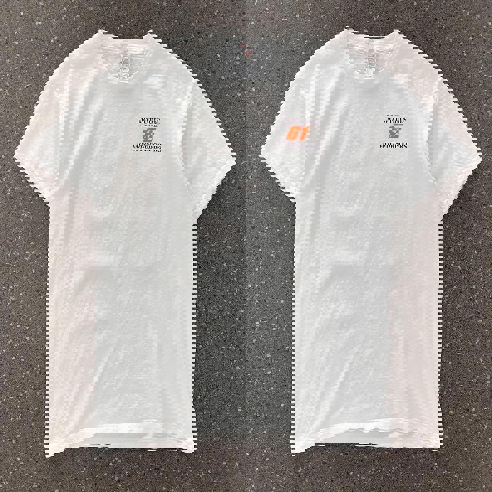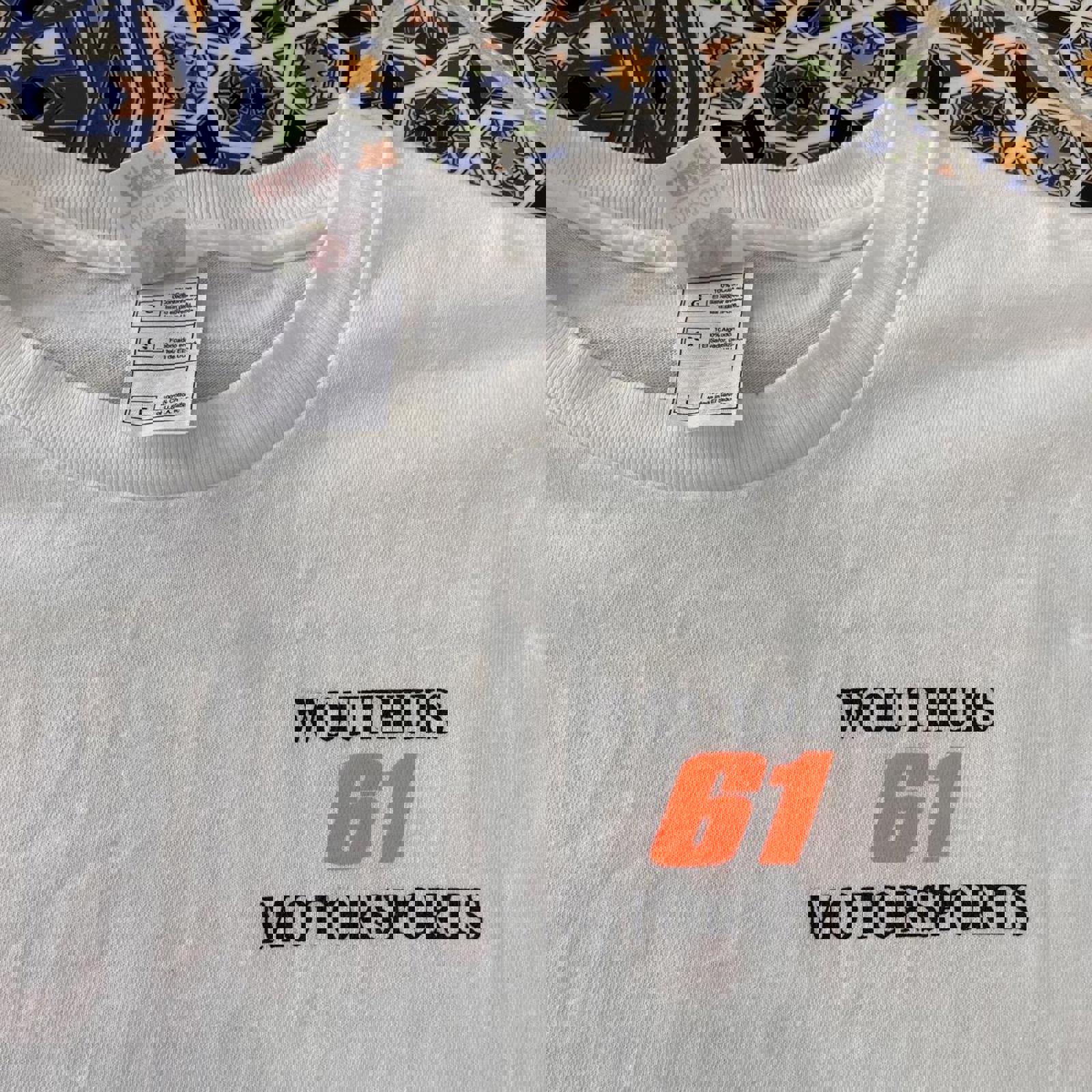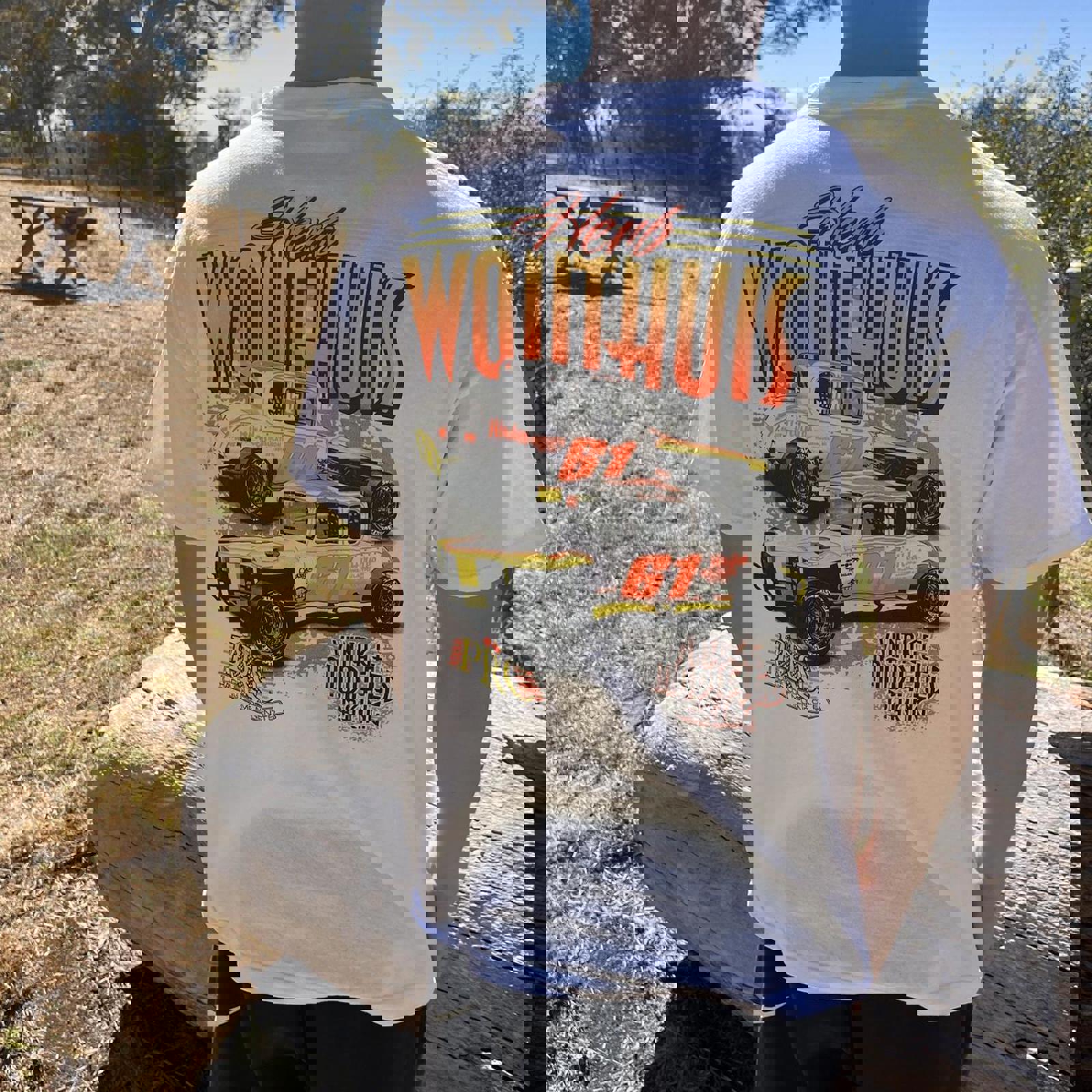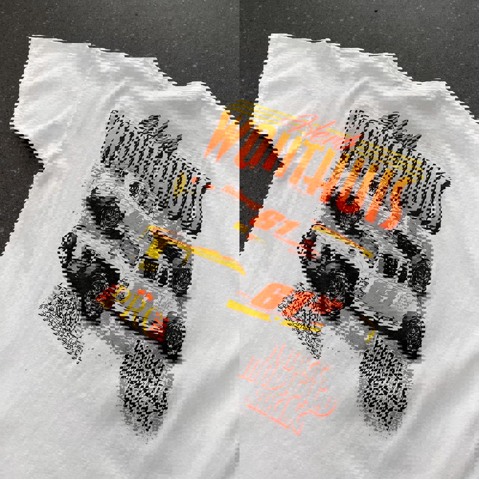 white fruit of the loom tee with a black and orange spell out graphic on the chest and a large vintage car graphic on the back