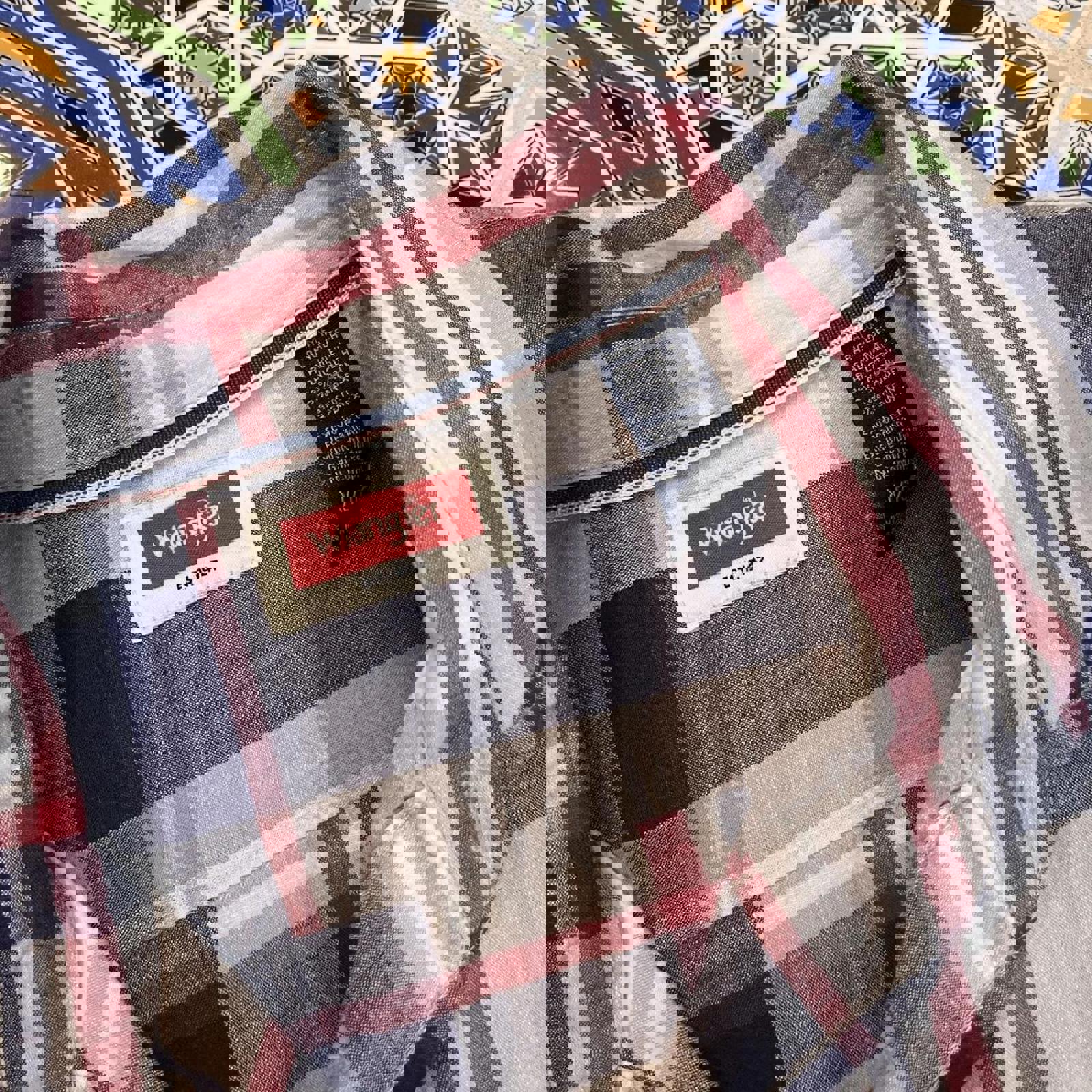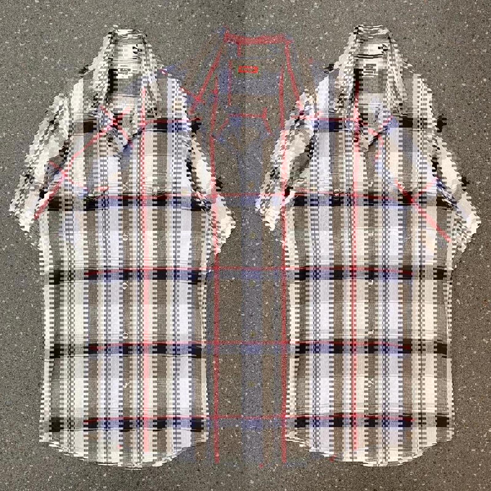 navy red and white wrangler short sleeved button up shirt with double chest pockets