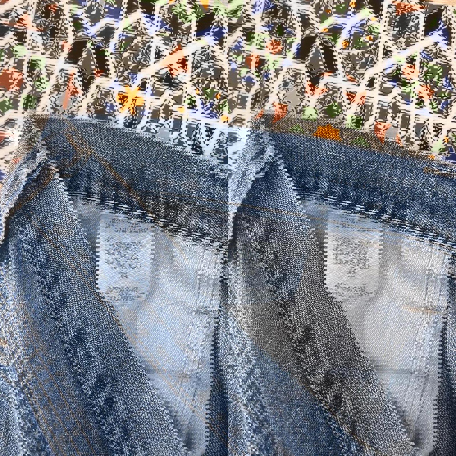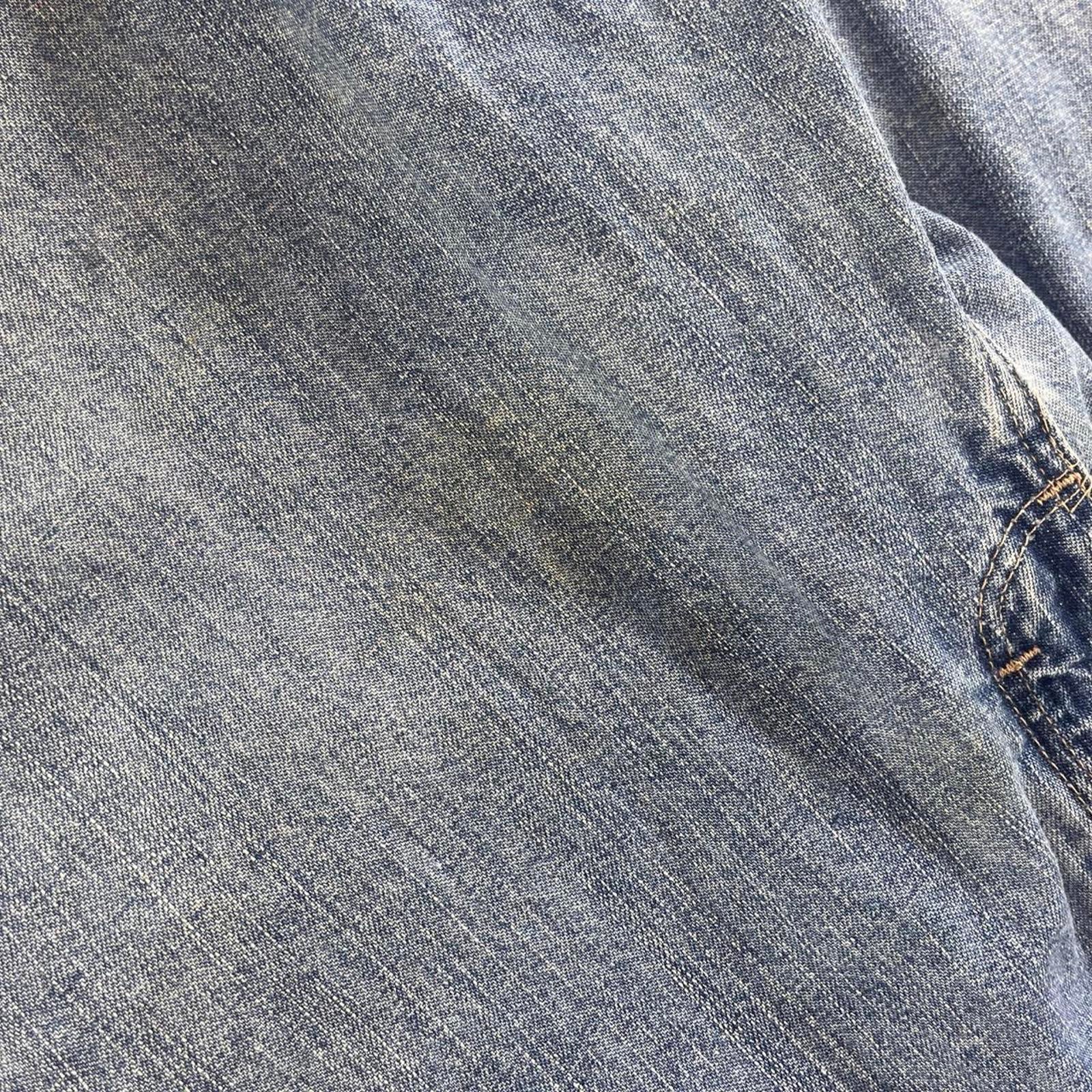 Light blue denim wrangler carpenter shorts with a cream patch on the back pocket