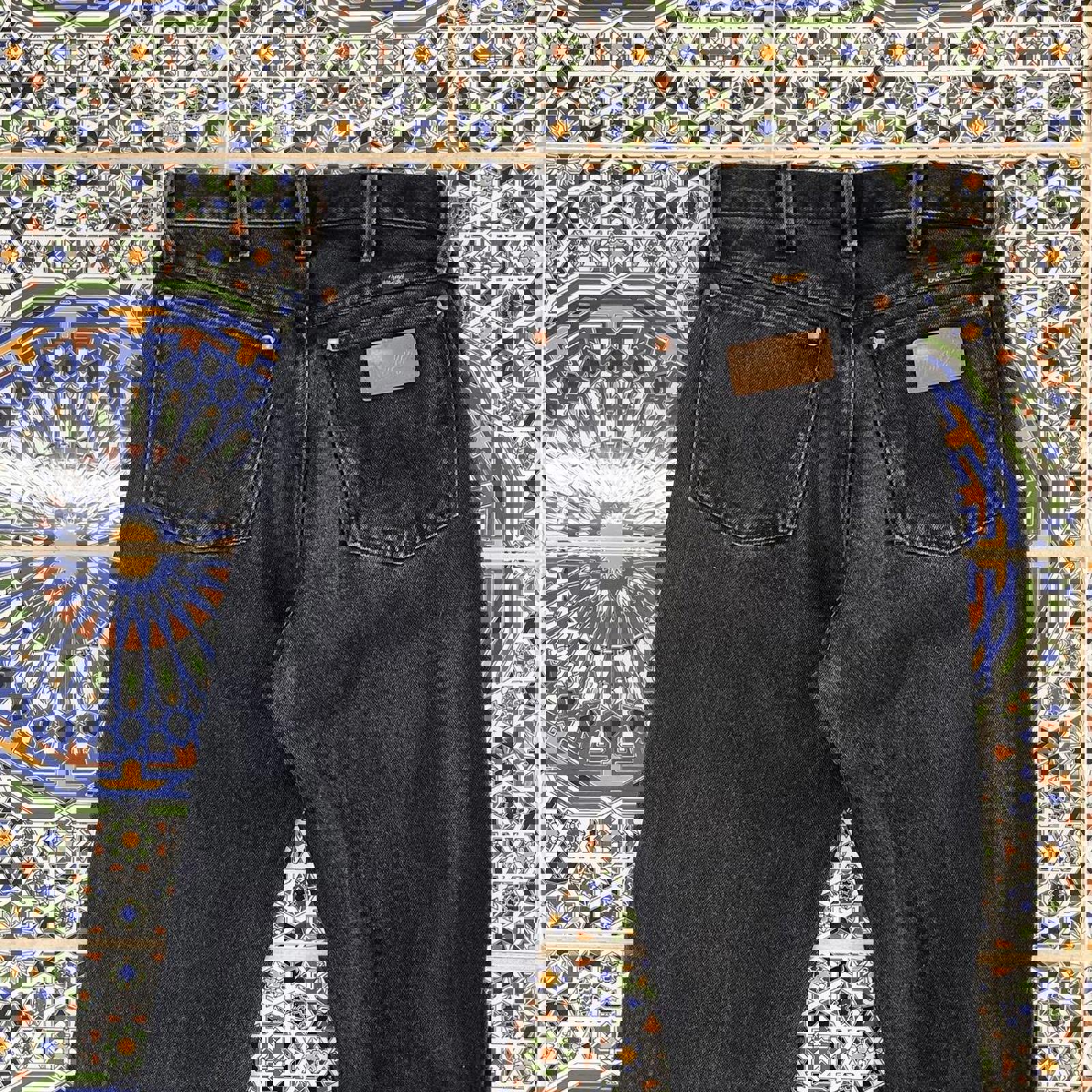 black denim wrangler jeans with a detailed button and a tan patch and black tab on the back pocket