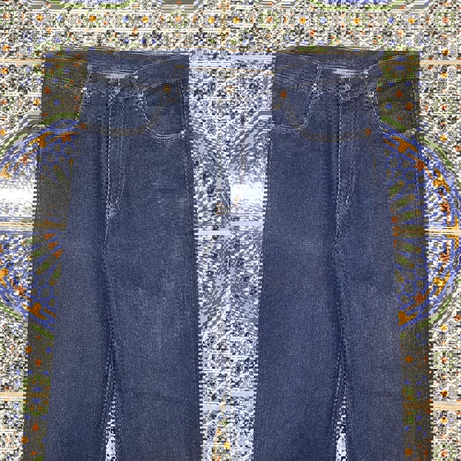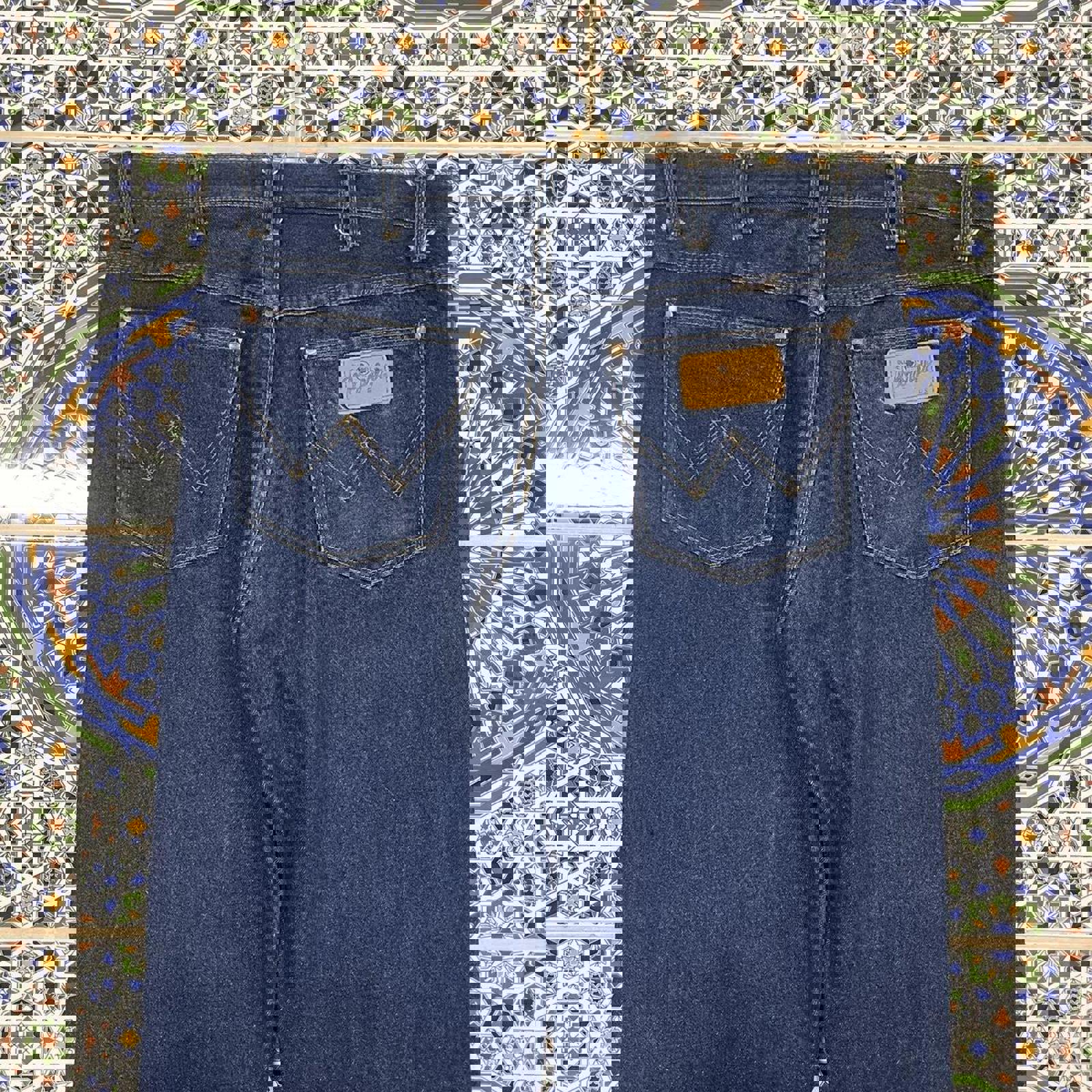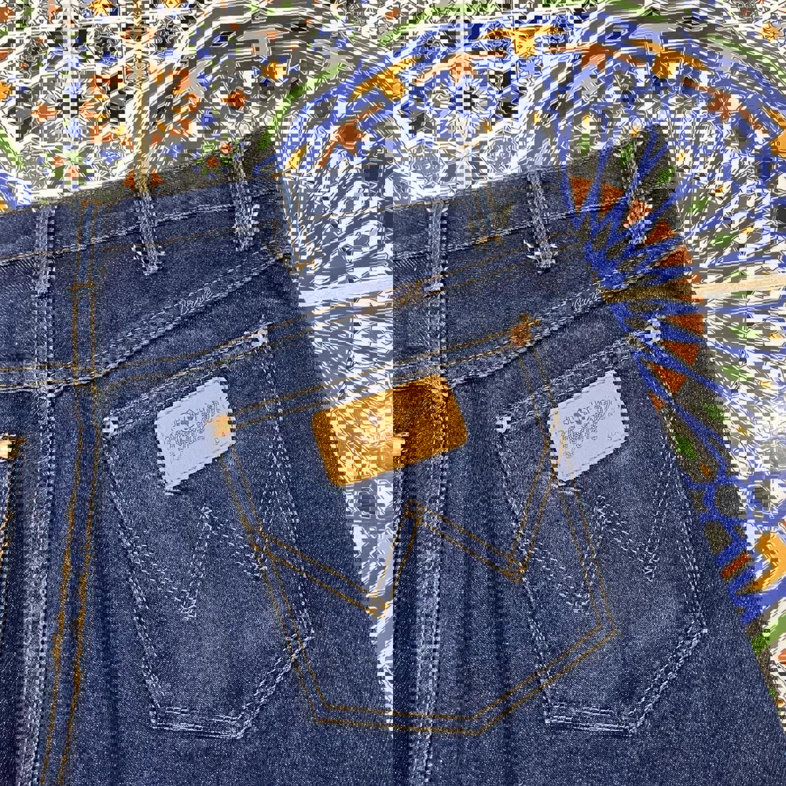 Dark navy wrangler straight legged denim jeans with a tan patch on the back pocket