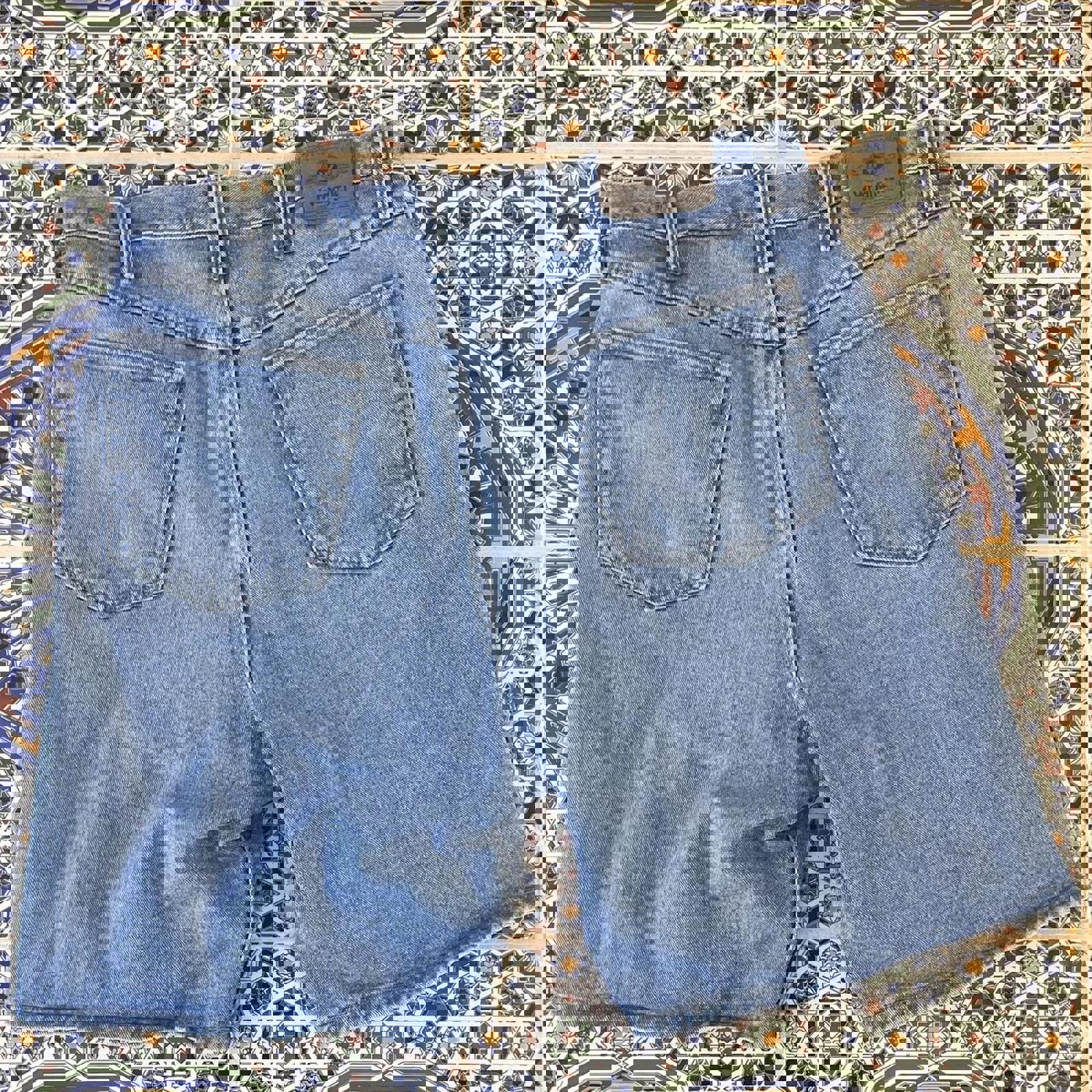 blue denim wrangler shorts with a patch on the back hip