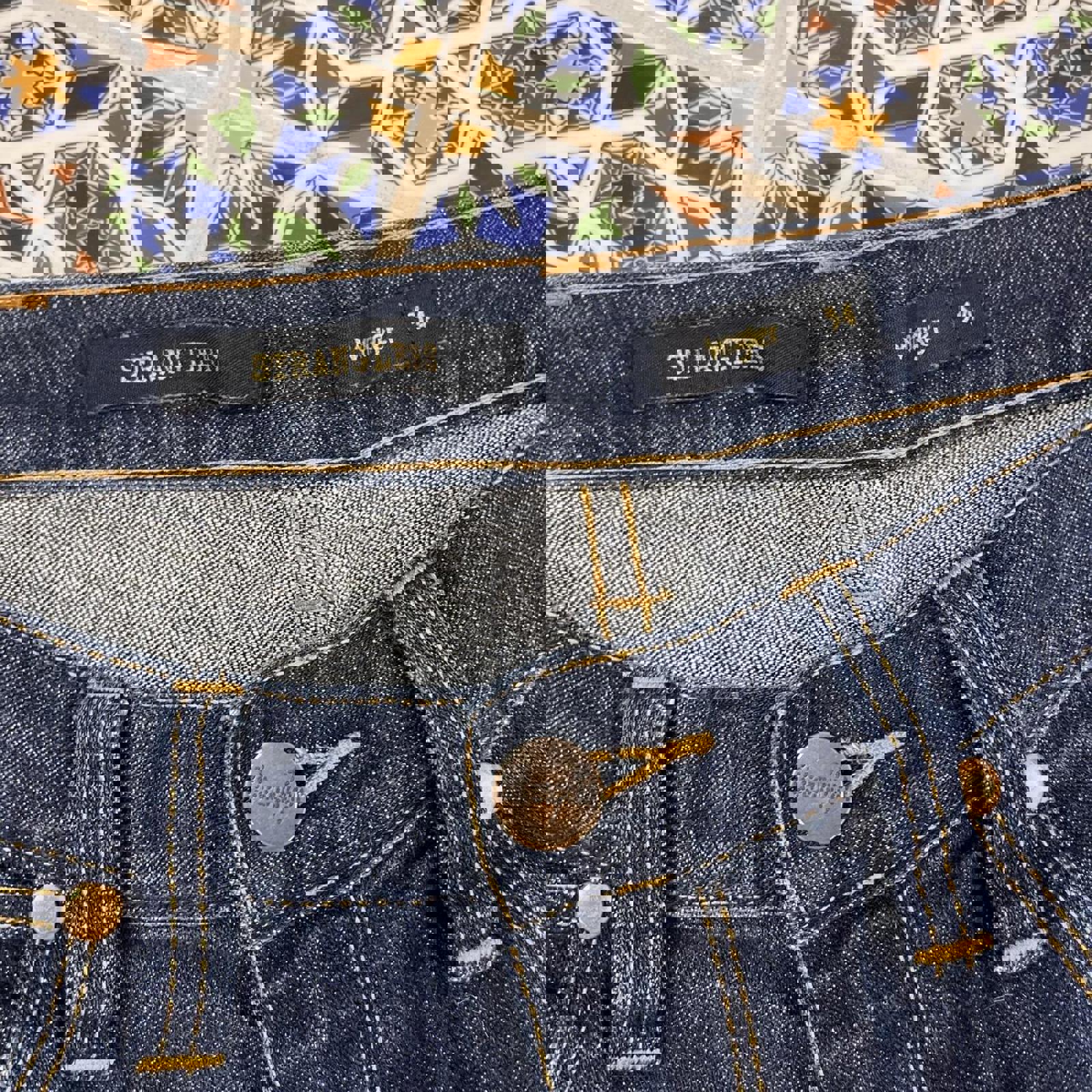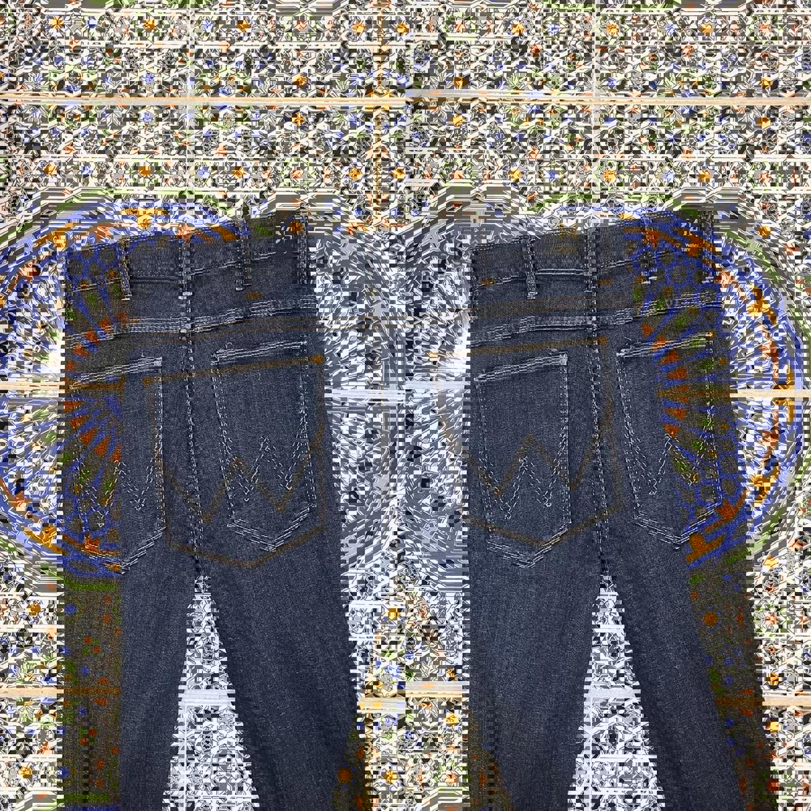 navy denim wrangler jeans with a detailed button and a black tab that can be removed on the back hip