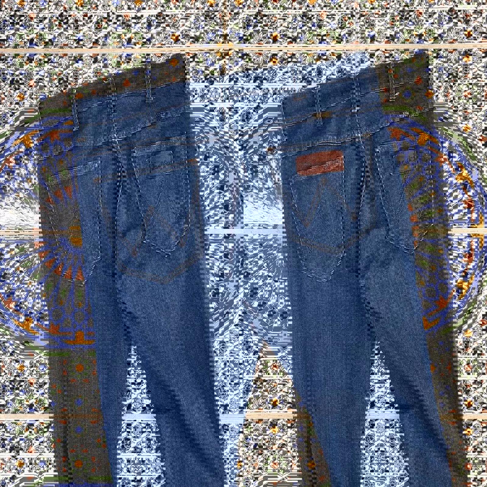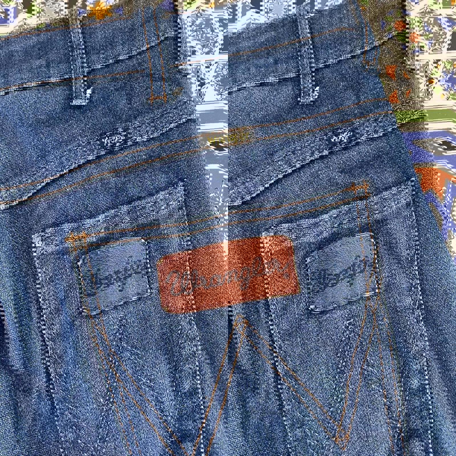 light blue denim wrangler jeans with a detailed button and a tan patch and black tab on the back pocket