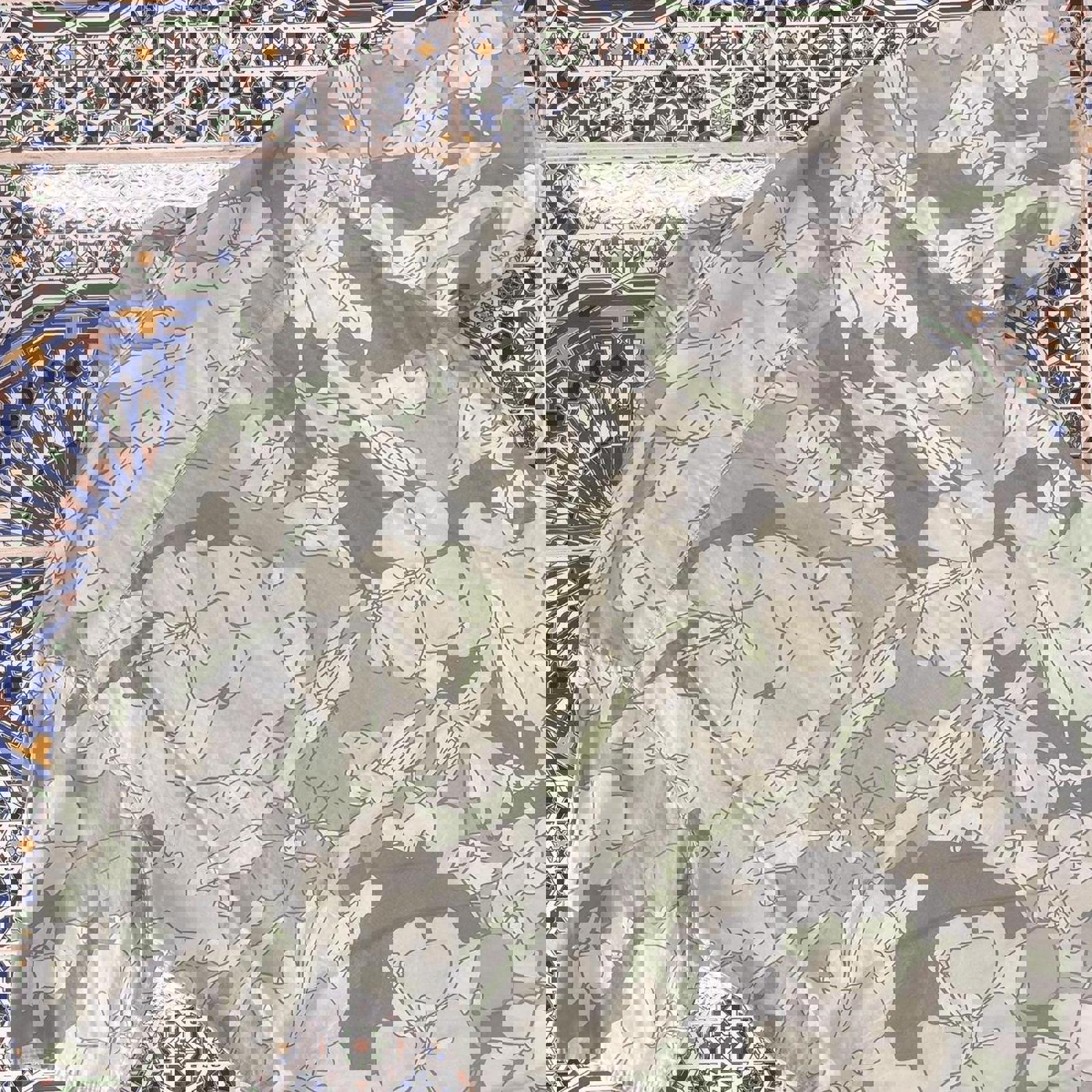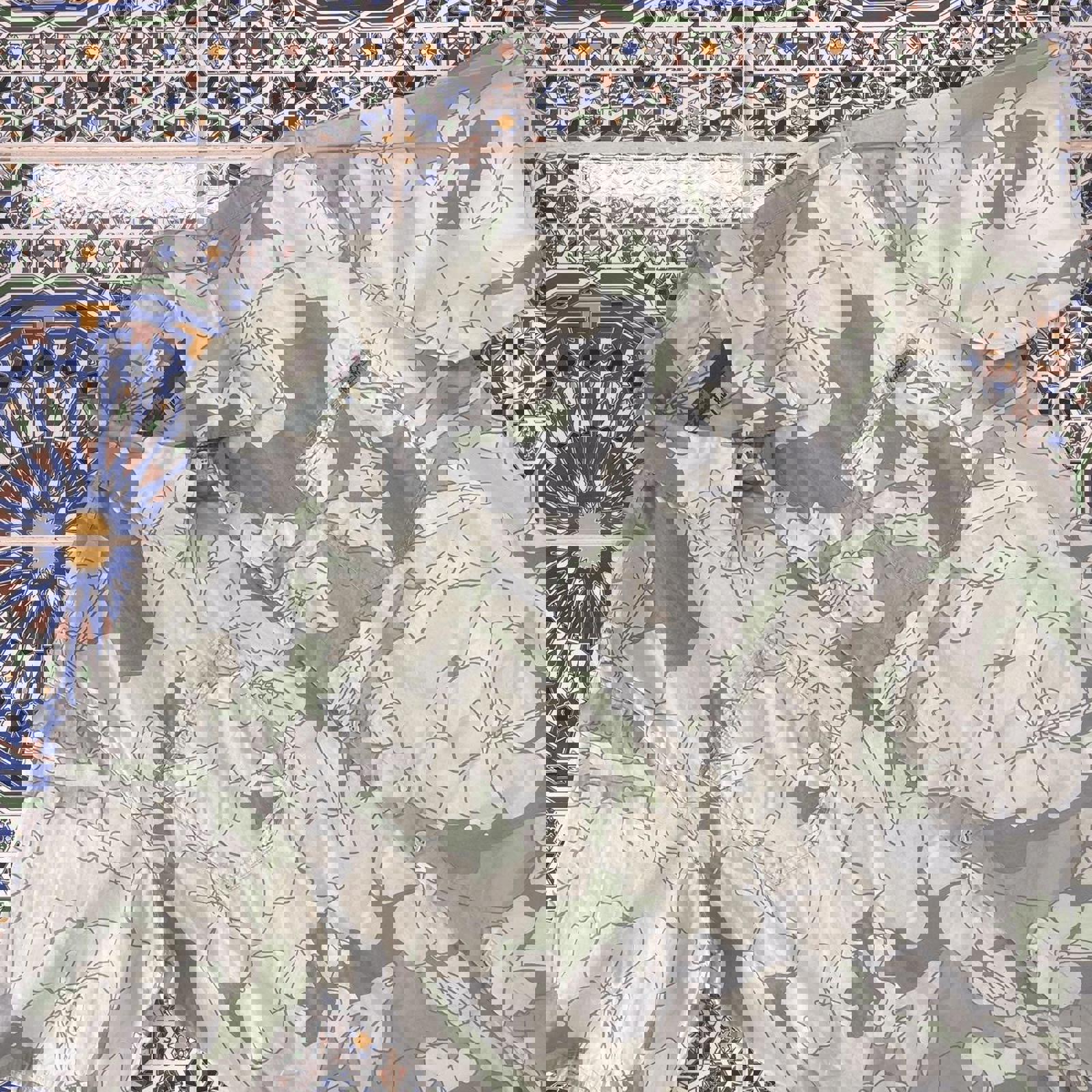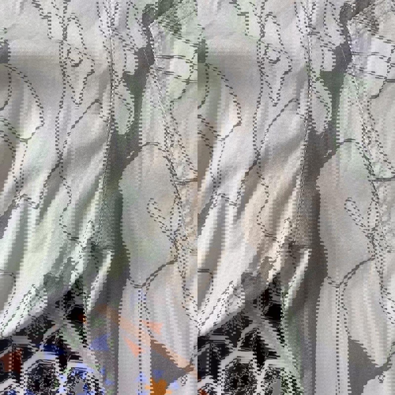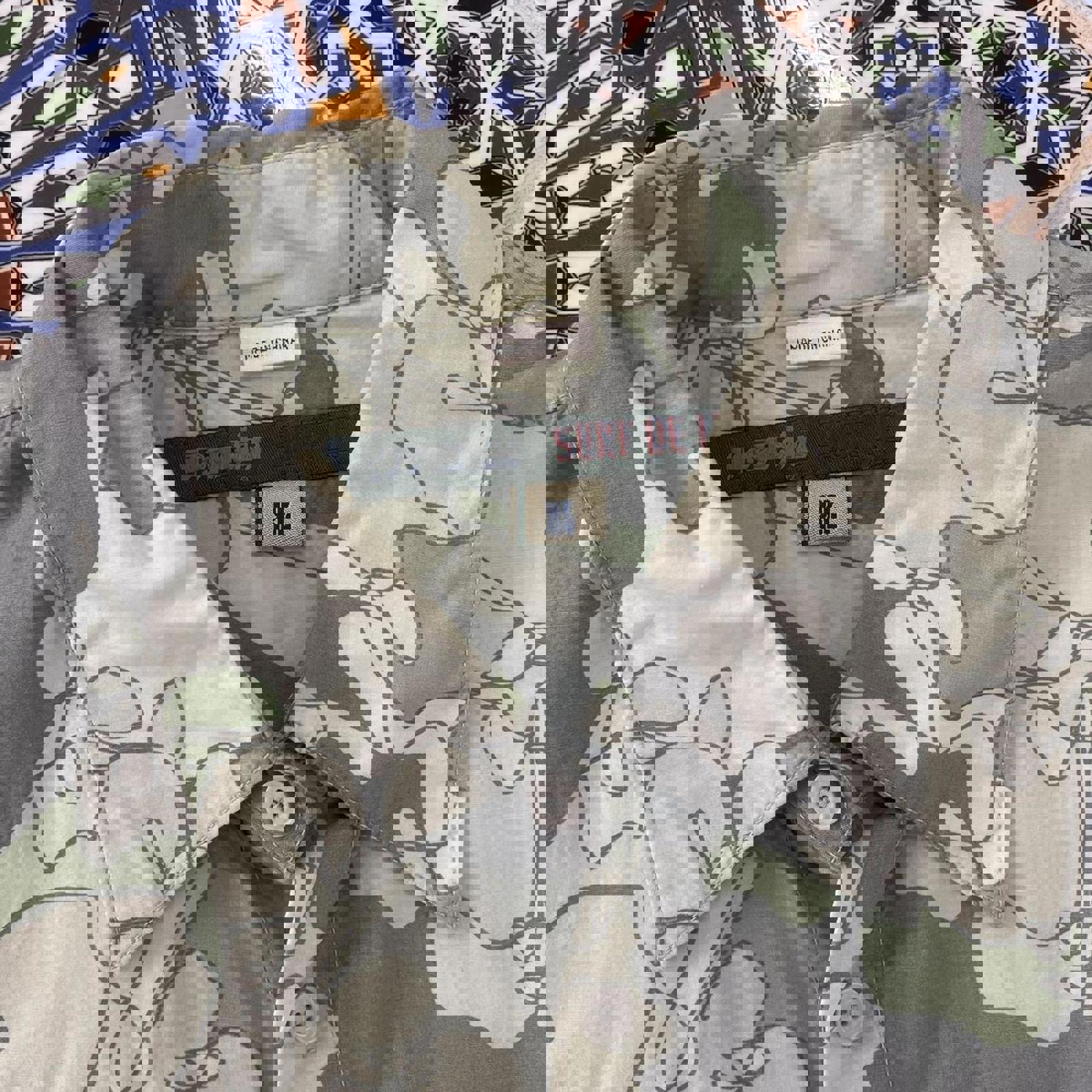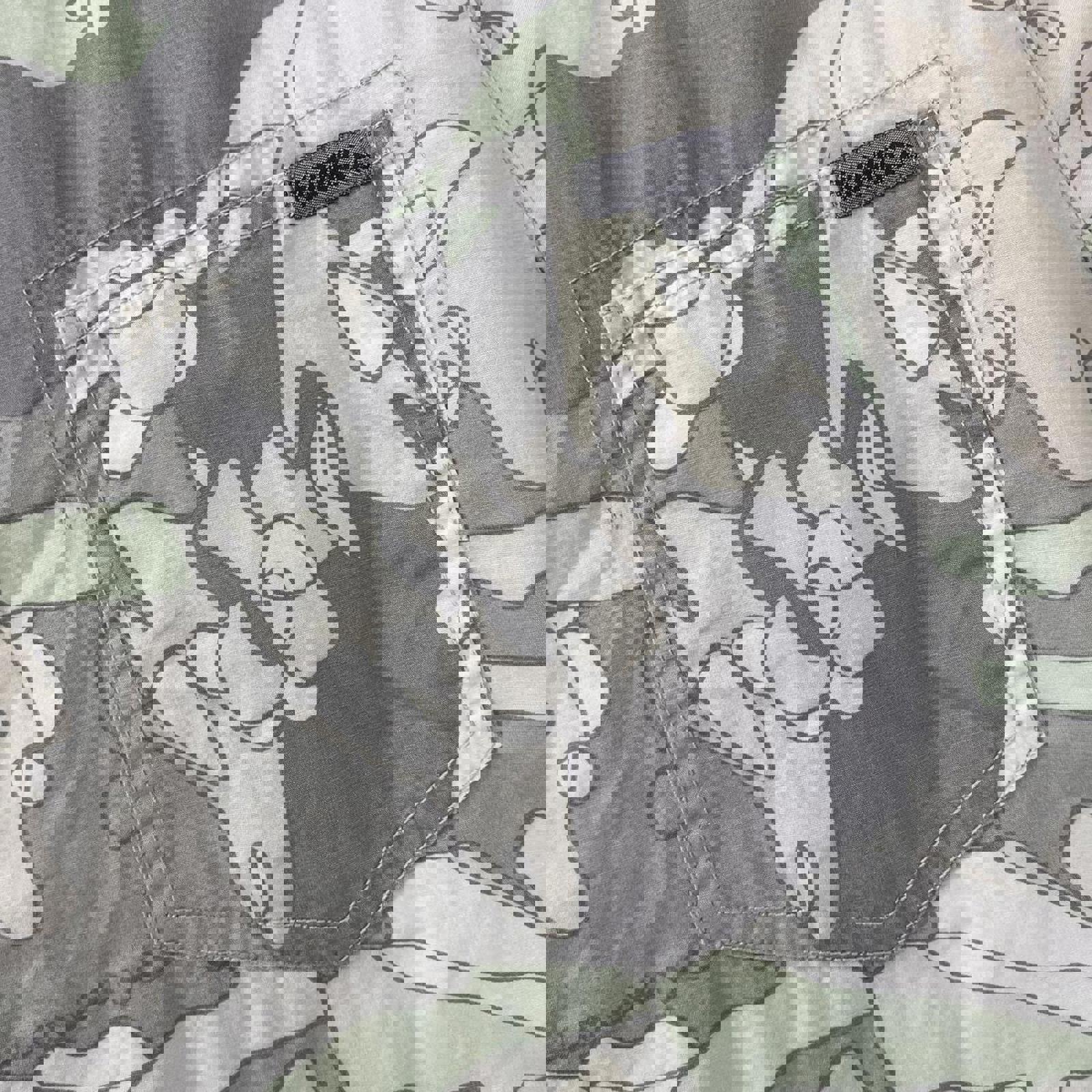 grey, green, tan and white Mambo short sleeved button up shirt with abstract pattern all over and a mambo patch on the chest pocket